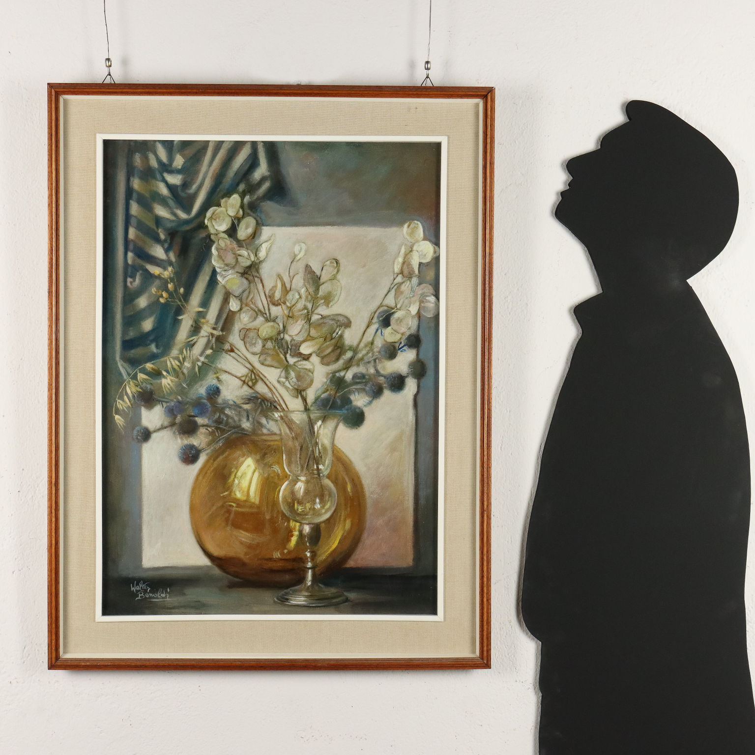 Olio su tela. Firmato in basso a sinistra. Il pittor parmense Walter Benoldi realizzò prevalentemente composizioni ricche di diversi elementi: qui propone fiorellini blu e foglioline secche poggiati in un calice e un vaso a boccia in vetro, che esalta le trasparenze, con un tessuto drappeggiato sulla prete retrostante. L'opera è presentata in cornice.