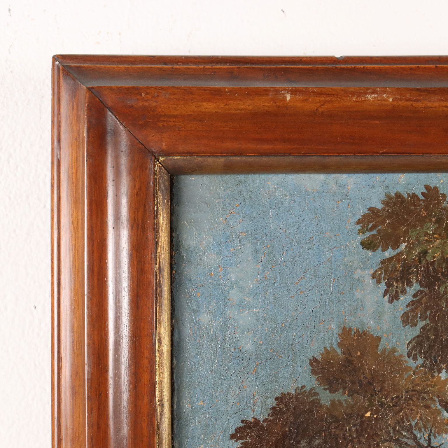 Olio su carta applicata a tela. Scuola centro-europea del XVIII secolo. Vivace e divertente scena di caccia al cinghiale, dove la bestia assediata dai cani e dai cavalieri obbliga un servitore, sulla sua traiettoria di fuga, a rifugiarsi di corsa su un albero. Una grande parte del dipinto di cm 46 x 67, corrispondente a tutta la scena centrale in primo piano (l'uomo che si arrampica sull' albero, il cinghiale e i cani da caccia, i due cacciatori a cavallo sulla destra), è composta da un'incisione su carta, dipinta ad olio e successivamente applicata sulla tela, ove si ha il completamento della scena. L'opera è montata su telaio recente. E' presentata in cornice di fine '800.