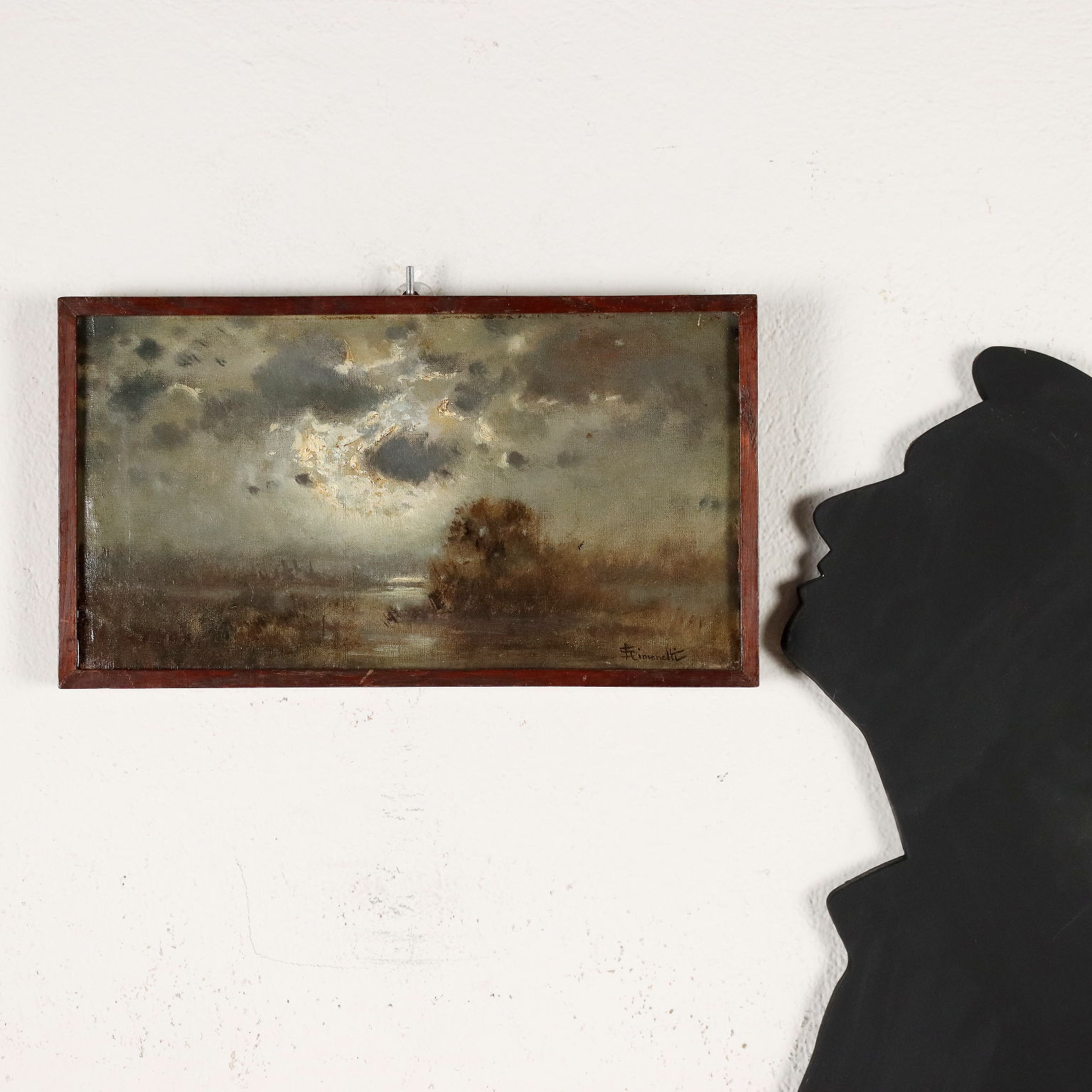Olio su tela. Firmato in basso a destra. Il pittore e antiquario romano Attilio Simonetti si affermò come pittore di genere , riproducendo ad olio ma soprattutto ad acquarello, scene in costume settecentesco, piuttosto che scene folkloristiche o anche orientaliste. Non mancano però anche scorci paesaggistici, lande della campagna romana piuttosto che scorci urbani. Il suo stile fu caratterizzato soprattutto da una tavolozza chiara e luminosa, dall'utilizzo di un colore brioso e brillante: in questo piccolo paesaggio di campagna, uno squarcio di luce intensa attraversa le nubi cupe e crea un riverbero sulla campagna sottostante, inondata dalla pioggia torrenziale. In cornice.