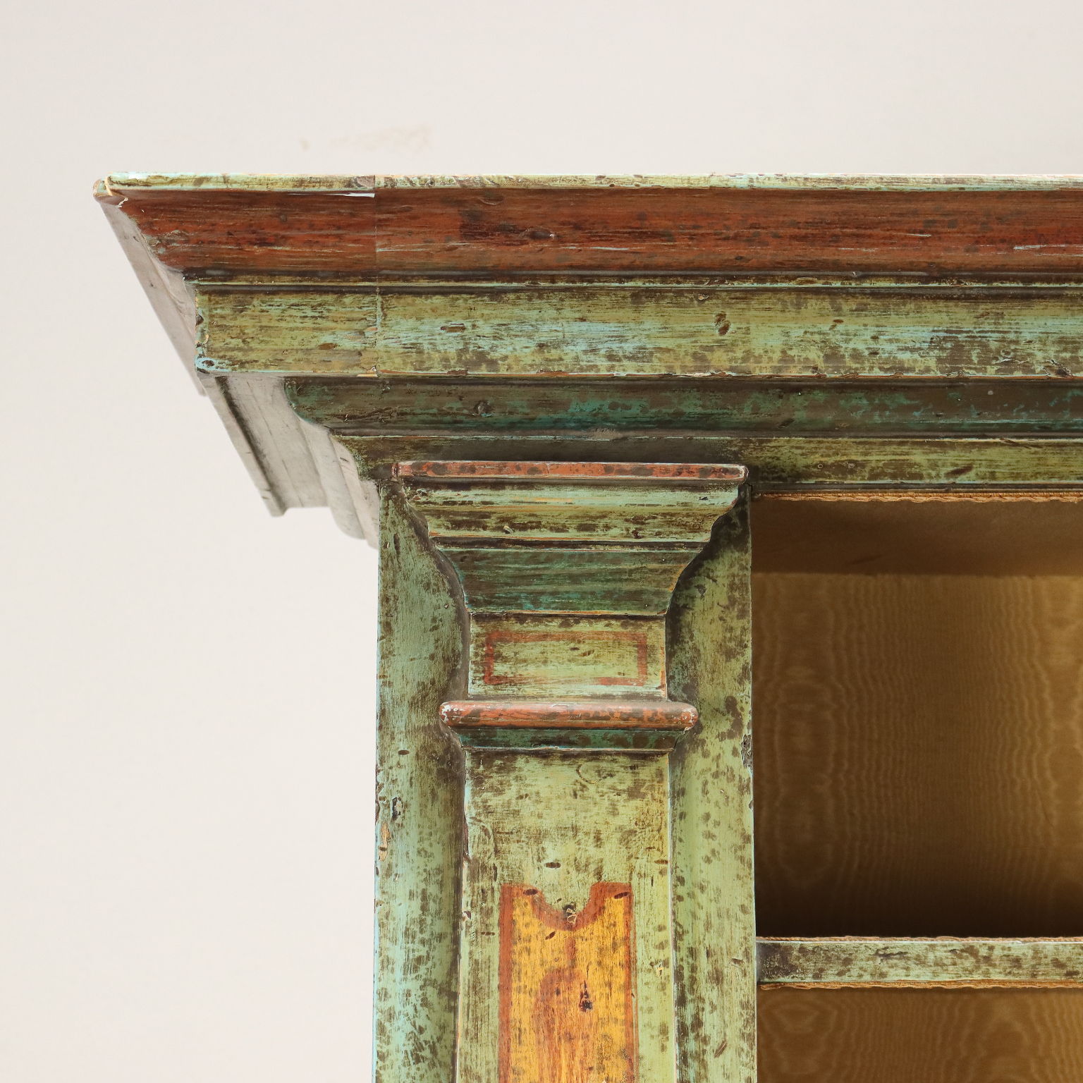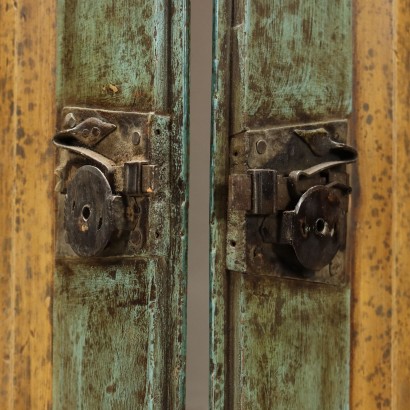 Librerie in legno laccato recanti parte superiore con ripiani e anta sottostante raffigurante vaso entro nicchia e motivi floreali. Italia XX secolo