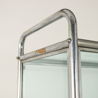 Vetrina con ripiani a posizione regolabile, ante scorrevoli. Metallo cromato, vetro.