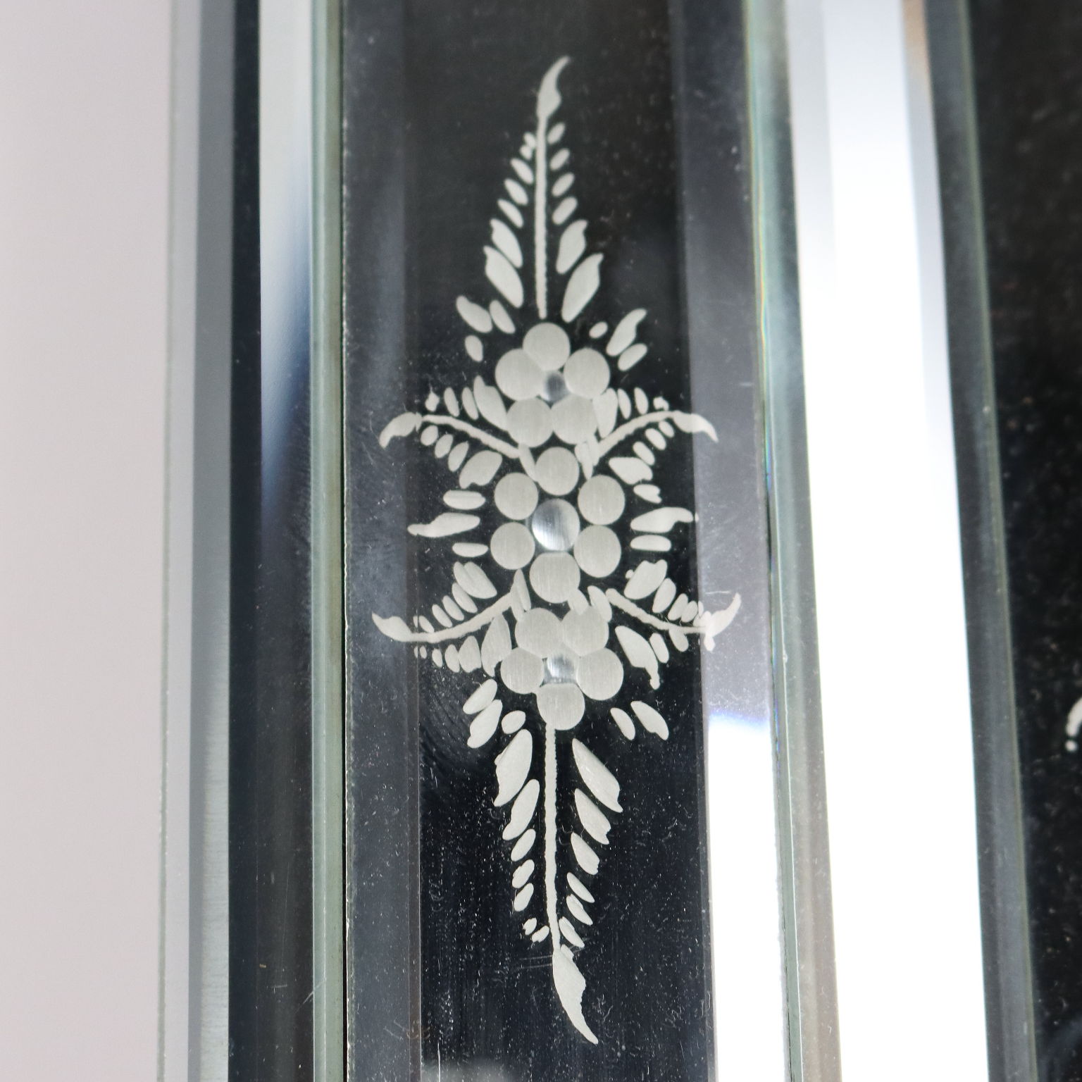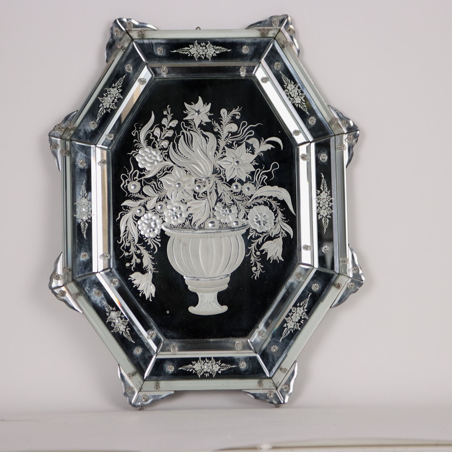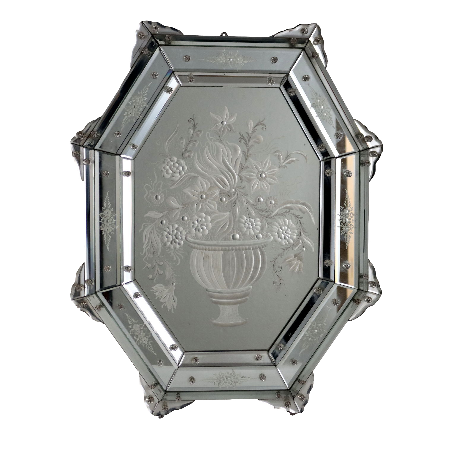 Specchio centrale acidato a formare raffigurazione di vaso con fiori che richiama le cornici di vetro acidato e bisellato a raffigurare motivi floreali. Italia inizio XX secolo