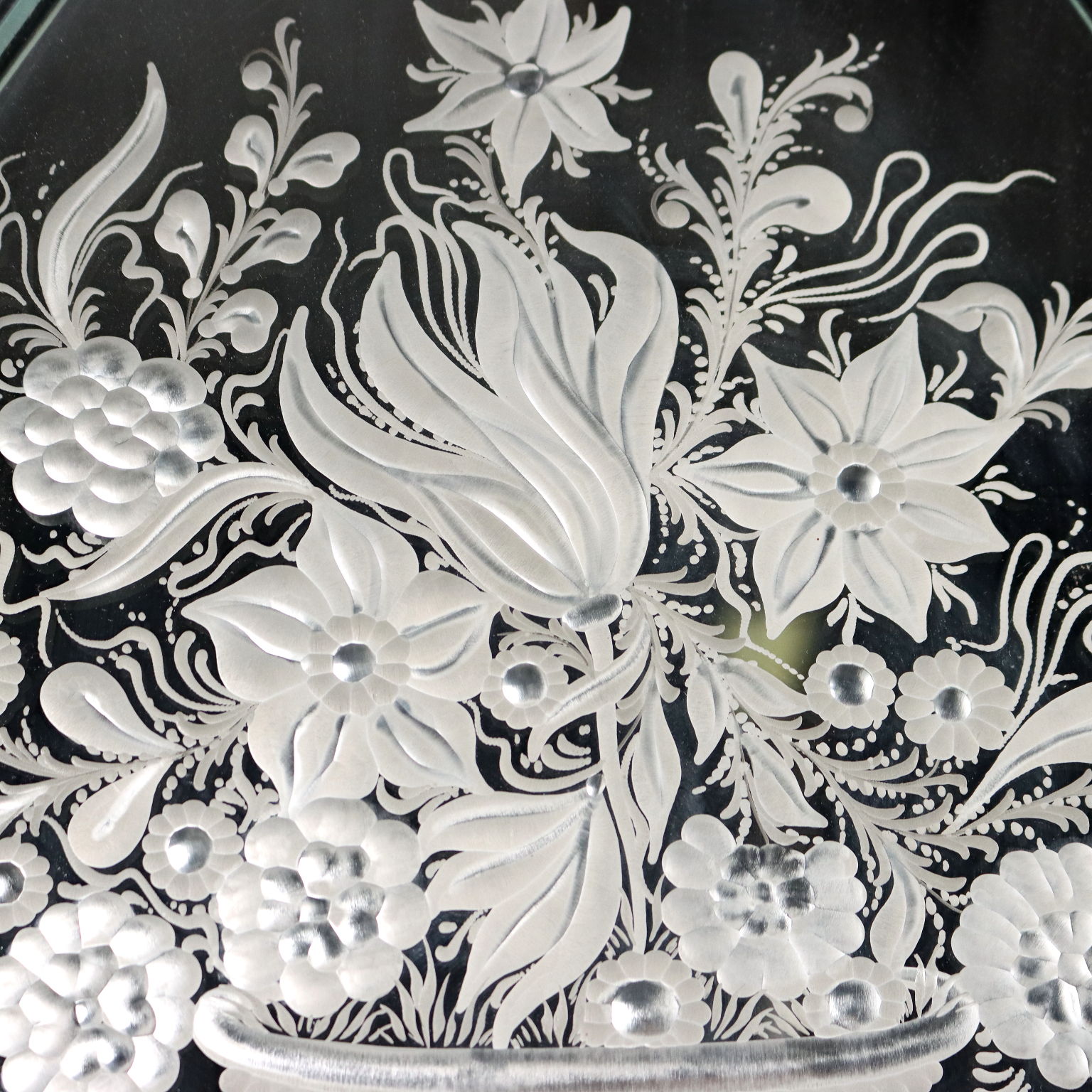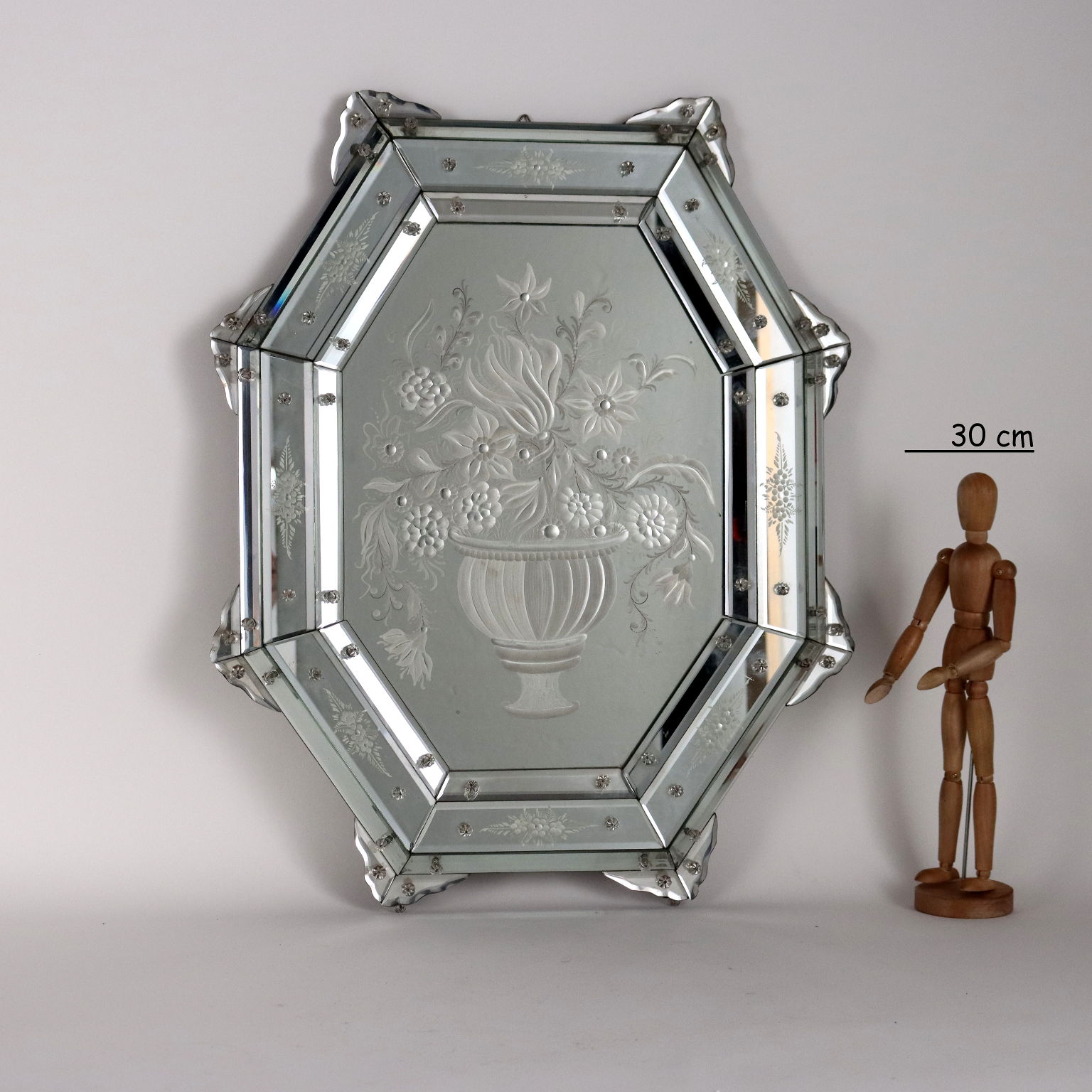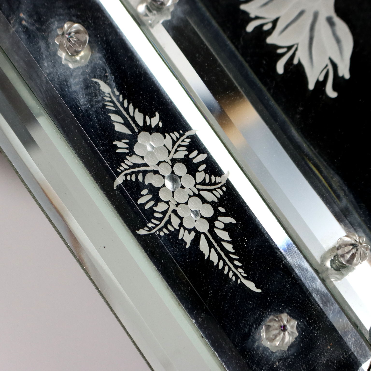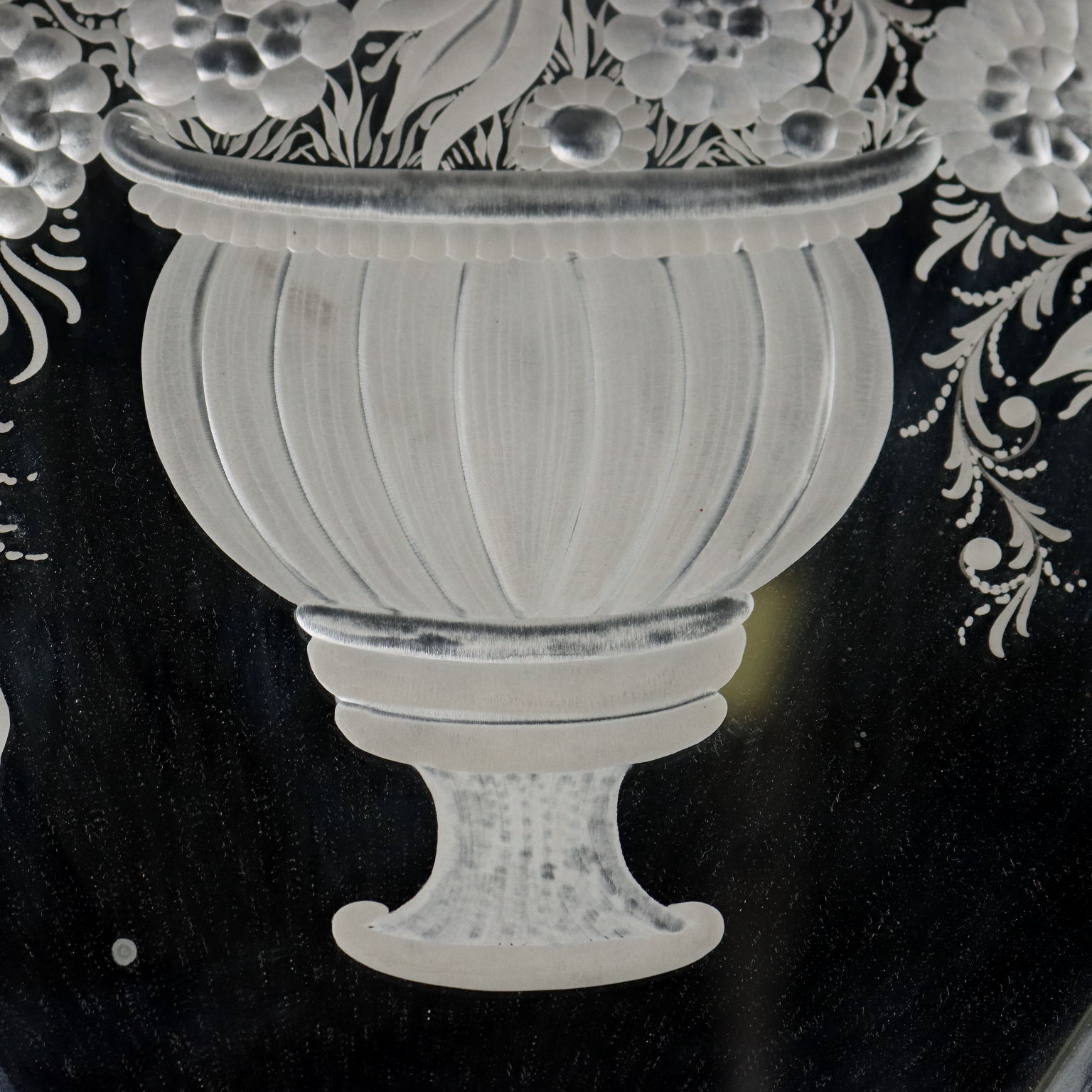 Specchio centrale acidato a formare raffigurazione di vaso con fiori che richiama le cornici di vetro acidato e bisellato a raffigurare motivi floreali. Italia inizio XX secolo