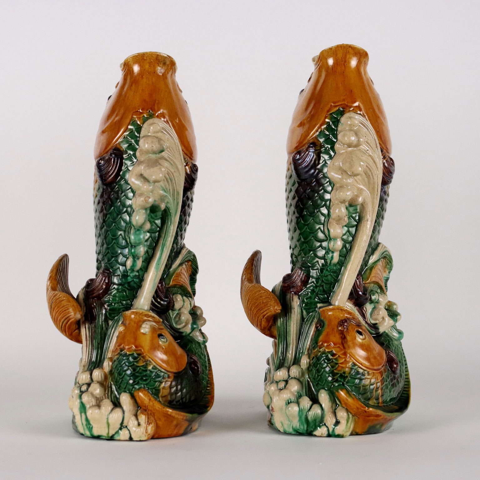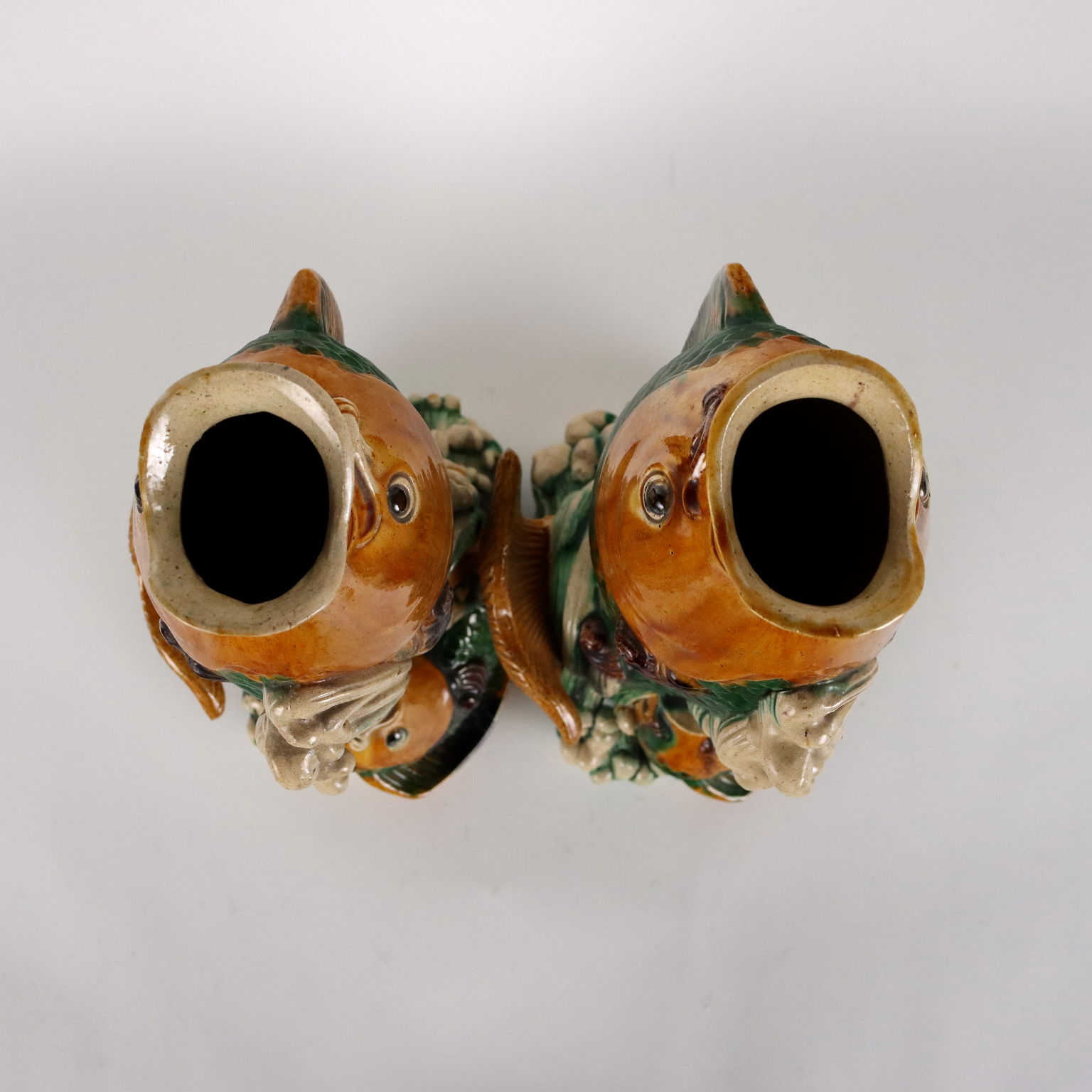 Coppia di vasi in ceramica policroma a foggia di pesci.