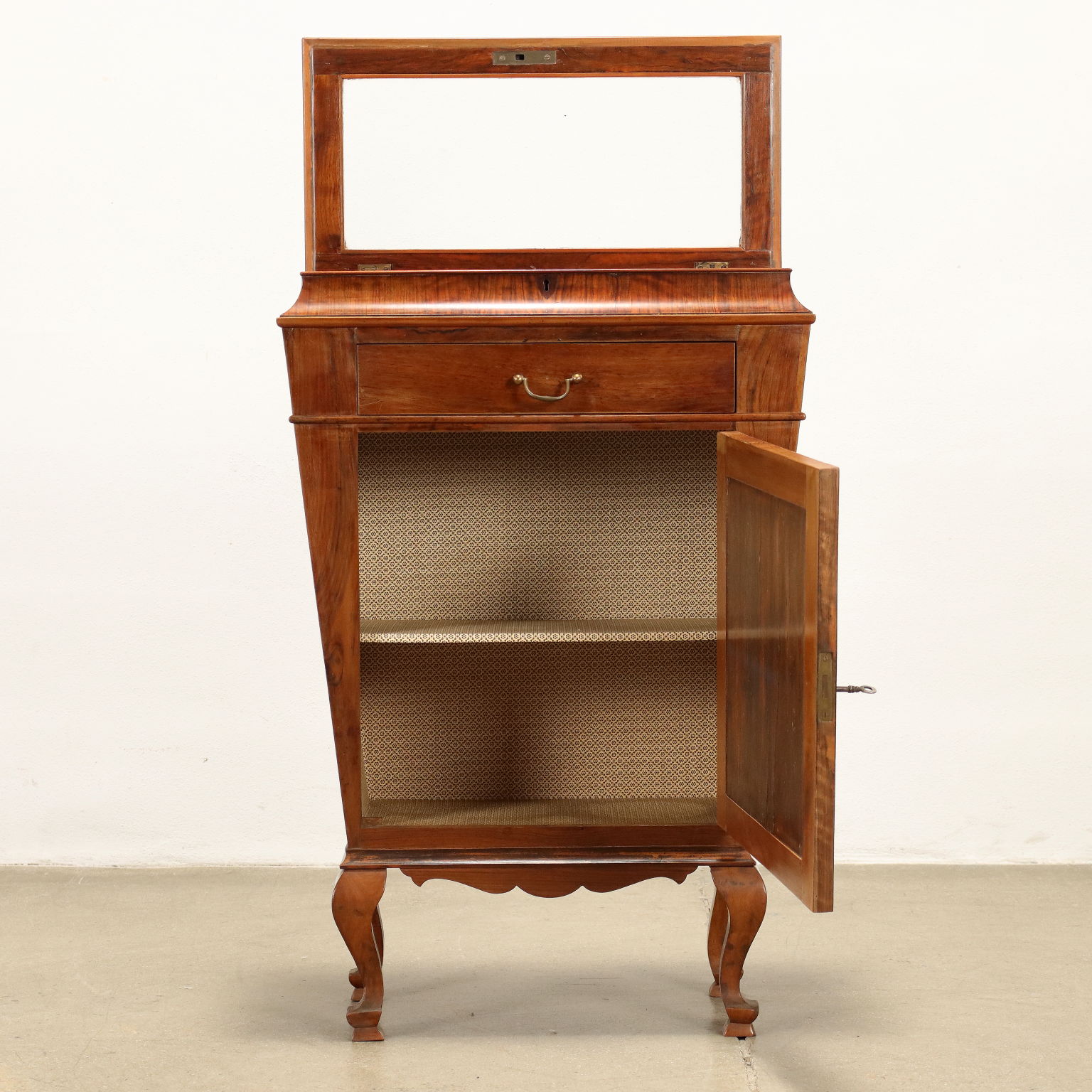 Comodino in noce con piano vetrato apribile, cassetto in fascia sottopiano e anta sottostante. Grembiale e gambette mosse. Italia XX secolo