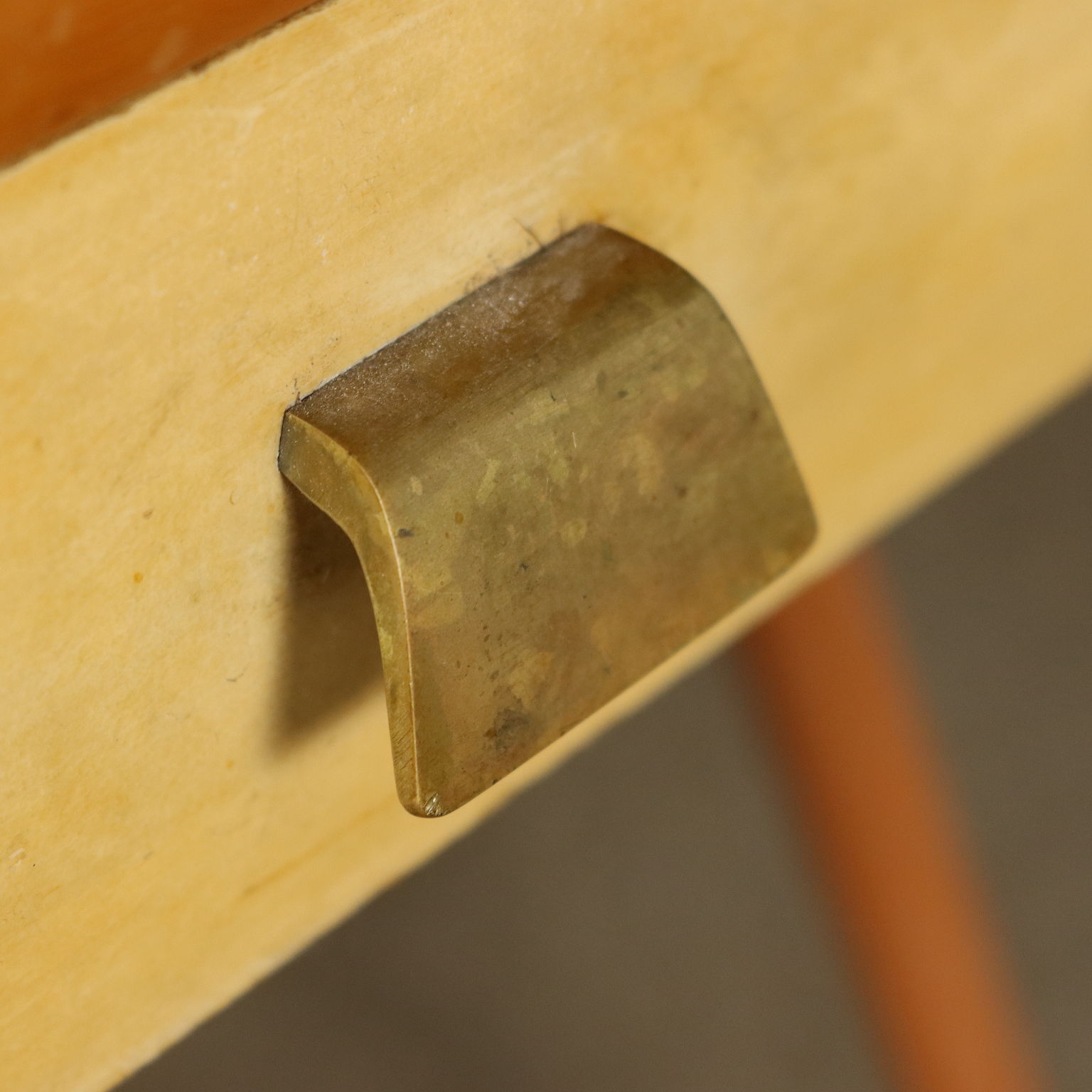 Particolare comodino con cassetto. Legno di faggio, impiallacciato acero, carta pergamena, vetro retro trattato.