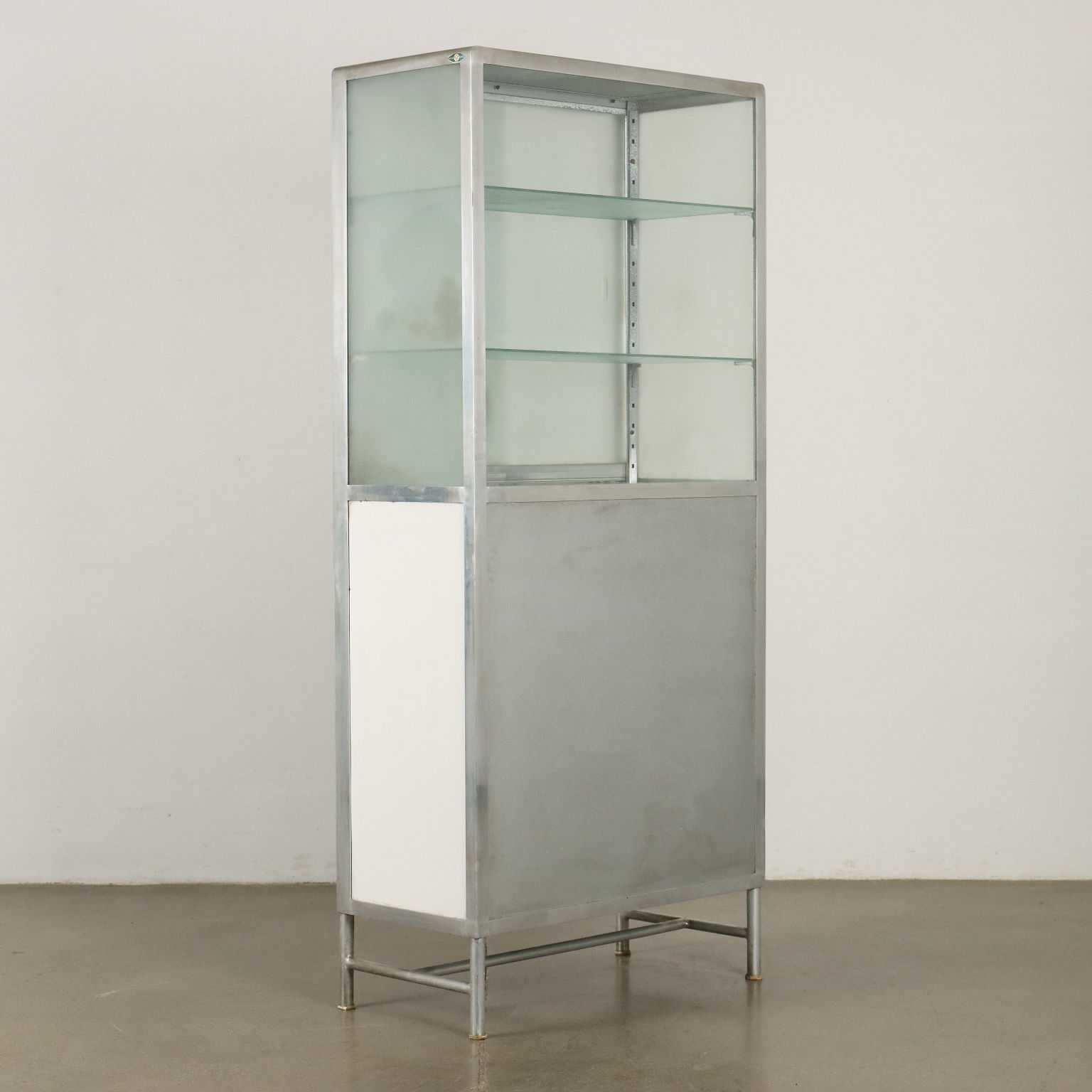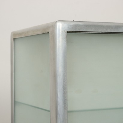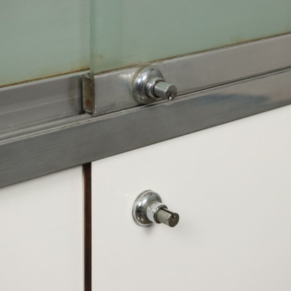 Vetrina con ripiani a posizione regolabile, ante scorrevoli. legno ricoperto in formica, metallo cromato, vetro trasparente e vetro satinato.