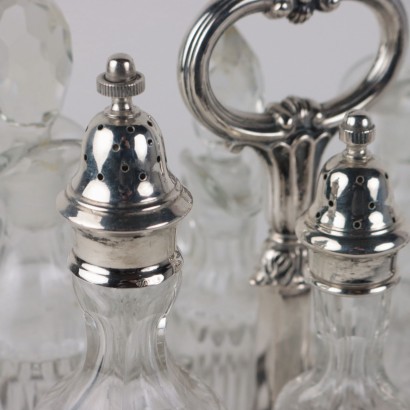 Oliera in argento e vetro molato con sei ampolle per olio, aceto, sale, pepe e salsa. Marchi dell'argento e dell'argentiere incussi. Grammi 690.