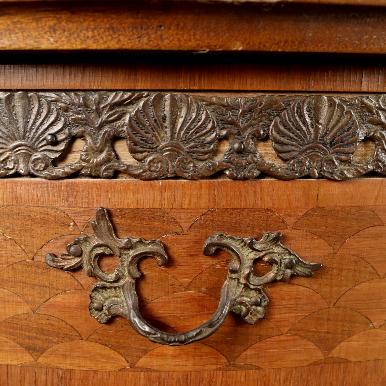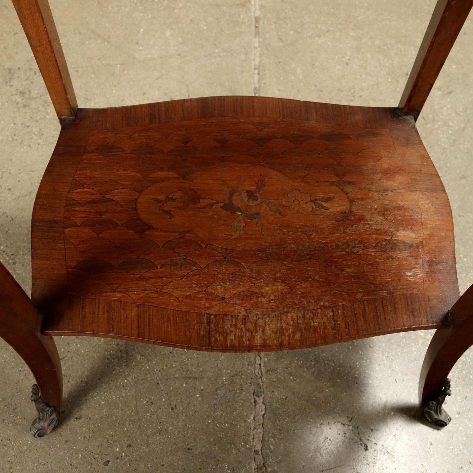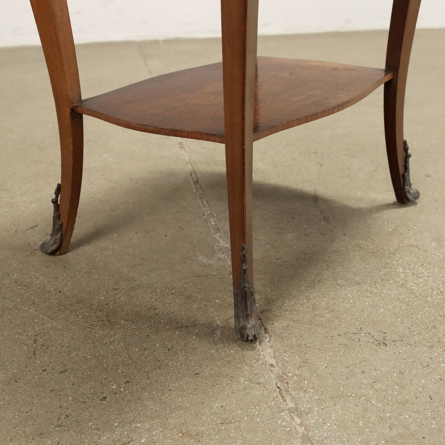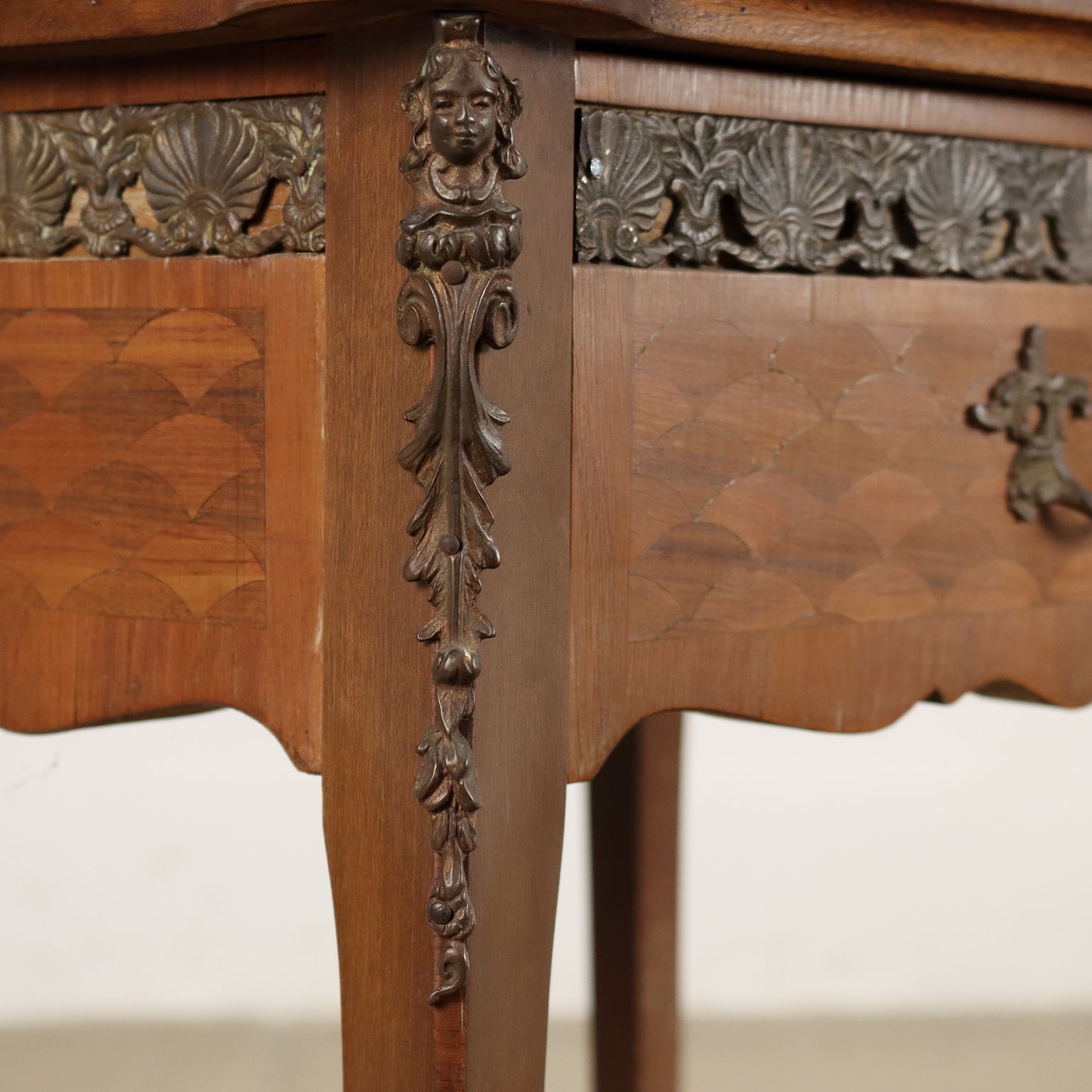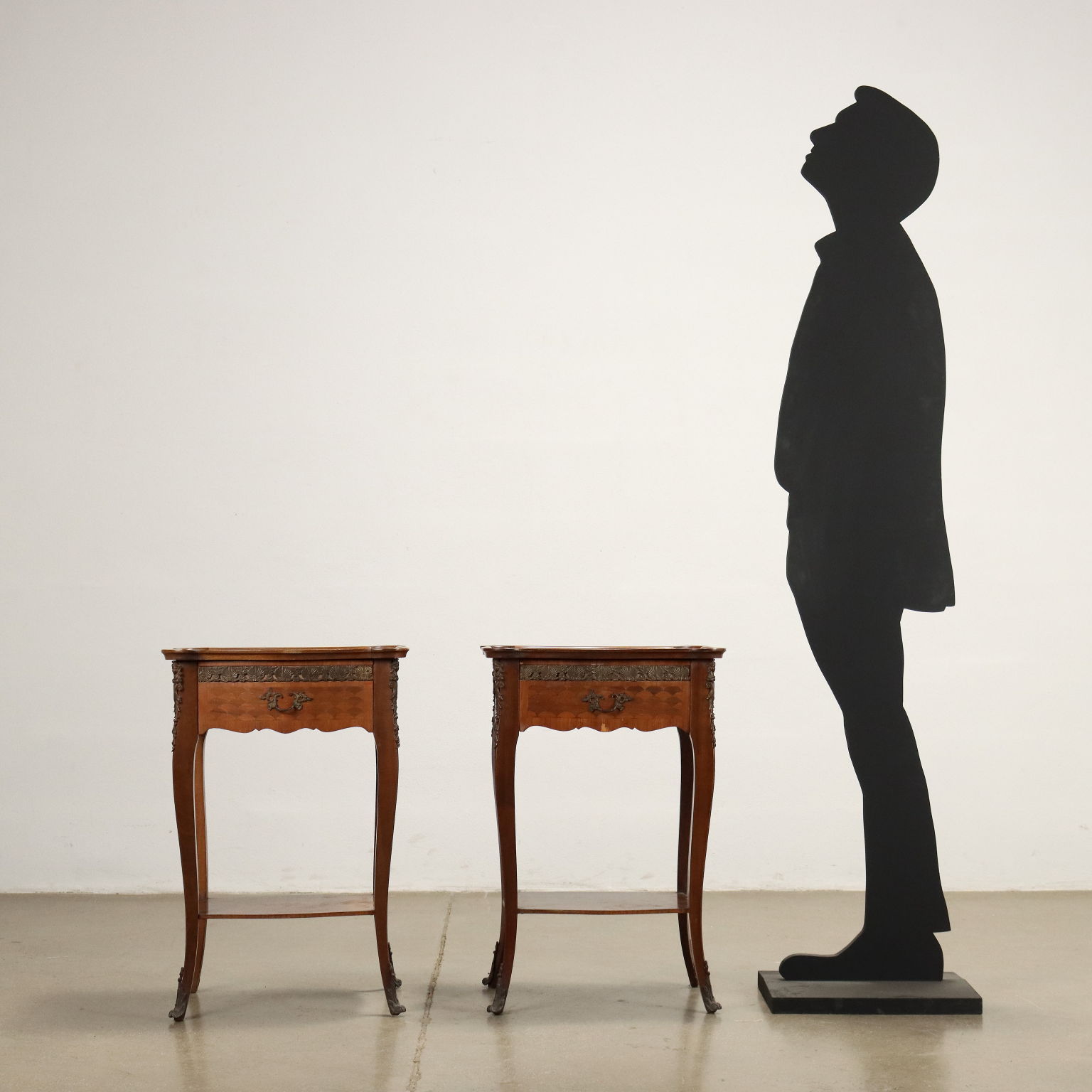 Comodini riccamente intarsiati raffiguranti motivi floreali e marquetterie su piano e pianetto di raccordo. Cassetto intarsiato con grembiale sagomato e bronzetti decorativi in fascia sottopiano e gambe mosse, piedini con scarpette. Italia XX secolo