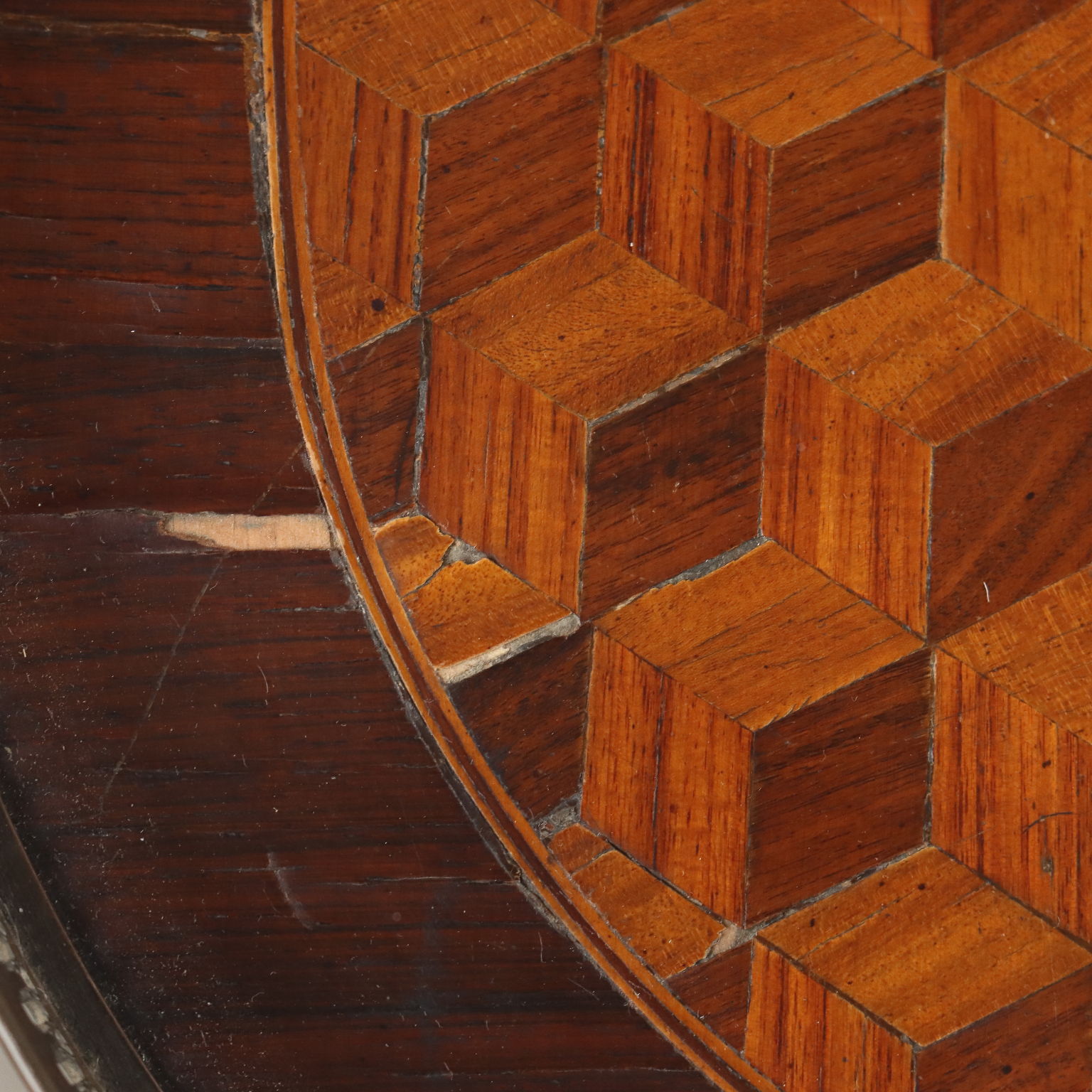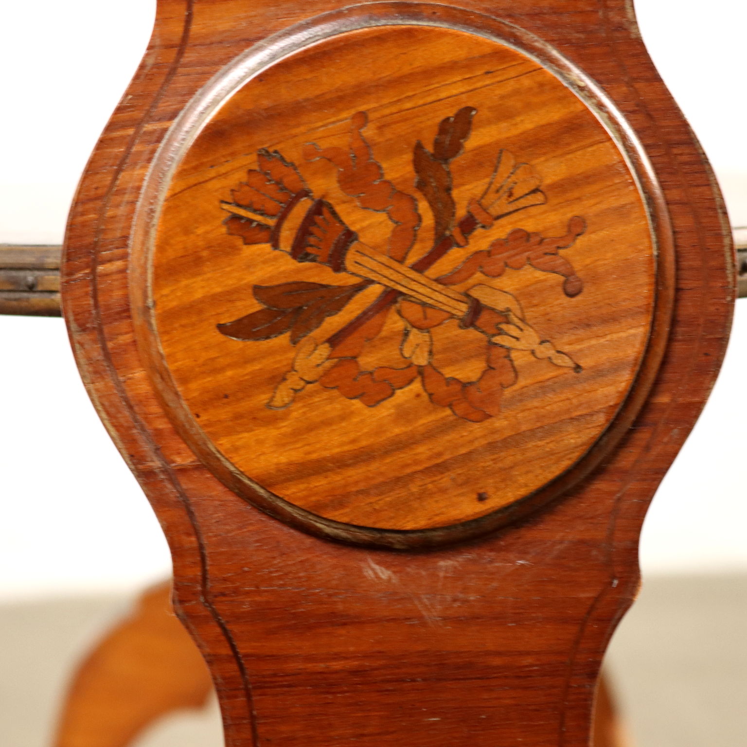Tavolino in stile sorretto da montanti mossi connessi da pianetto ovale; il piano superiore presenta cassetto nella fascia sottostante e ringhierina in bronzo; interamente intarsiato in essenze varie, è ornato con maniglie e applicazioni bronzee.