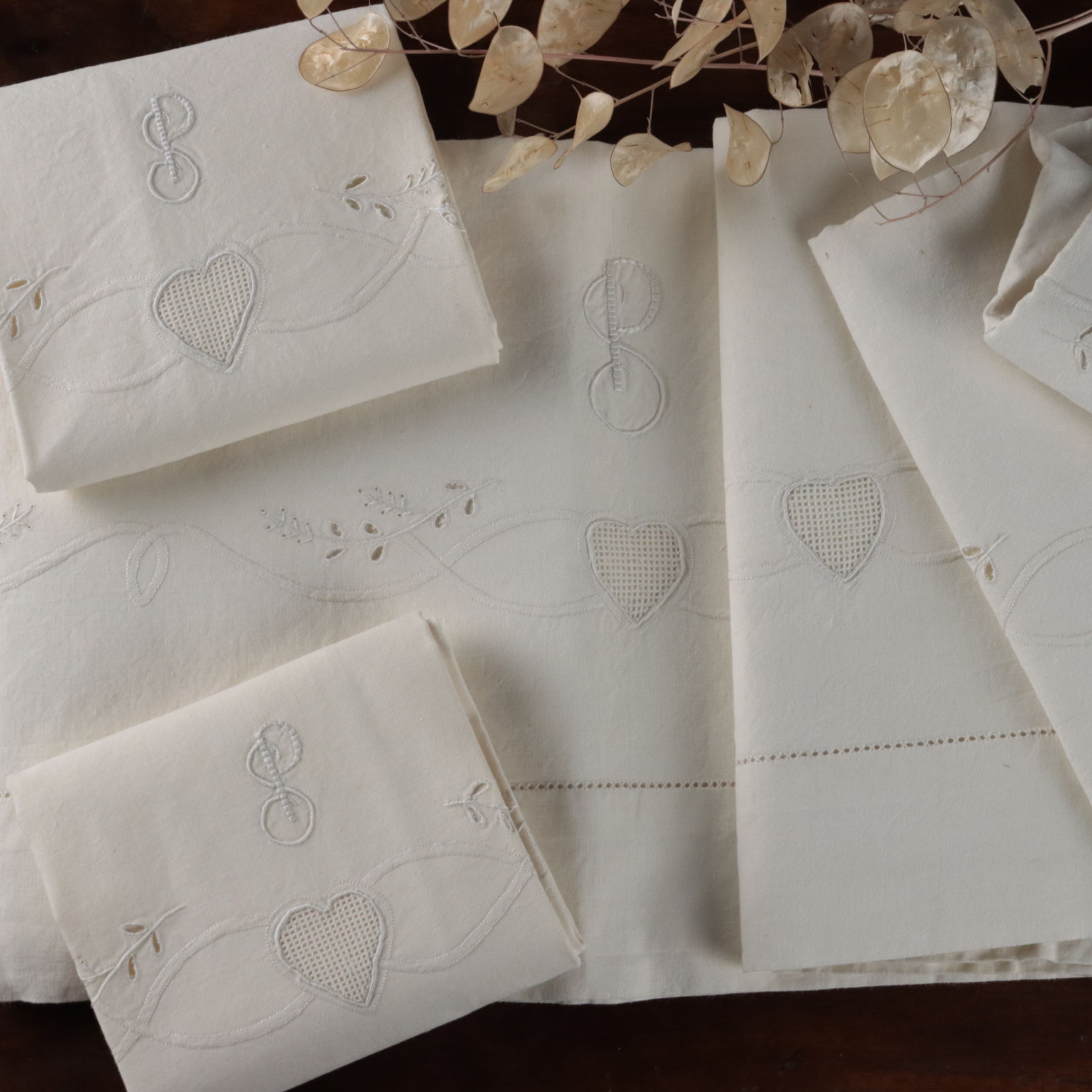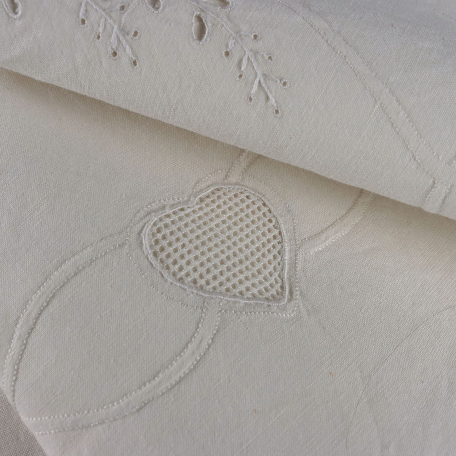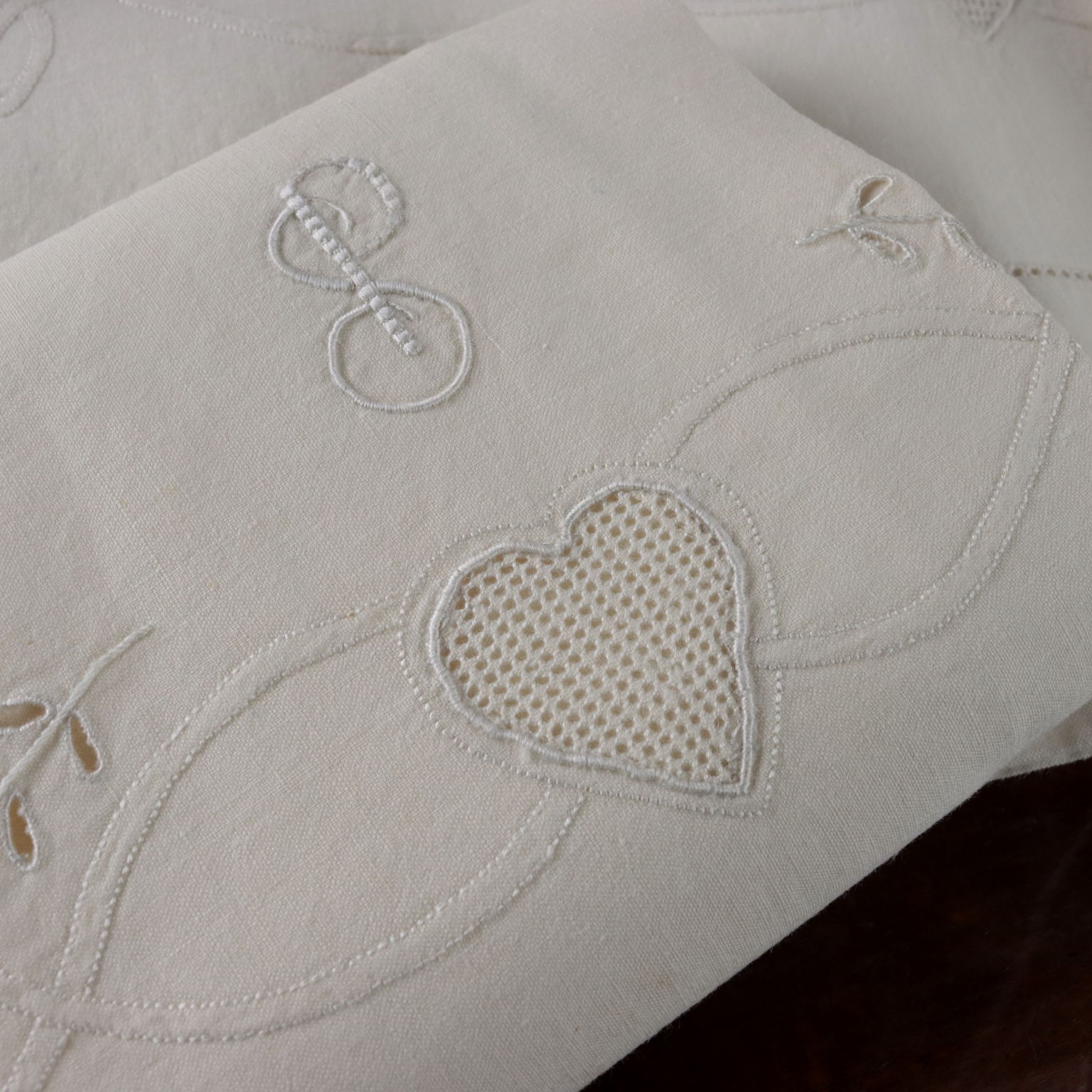Completo matrimoniale con due federe Raffinata la reversina ricamata in punto pieno, punto rodi, punto ombra, punto intaglio cifrata "SP" a tema floreale. Le due federe si chiudono con allacciatura a bottoni In alcuni punti sono presenti segni del tempo e lievi aloni. Colore bianco panna Composizione lino Dimensioni Lenzuolo cm 256 x cm 232 Federe cm 82 x cm 44