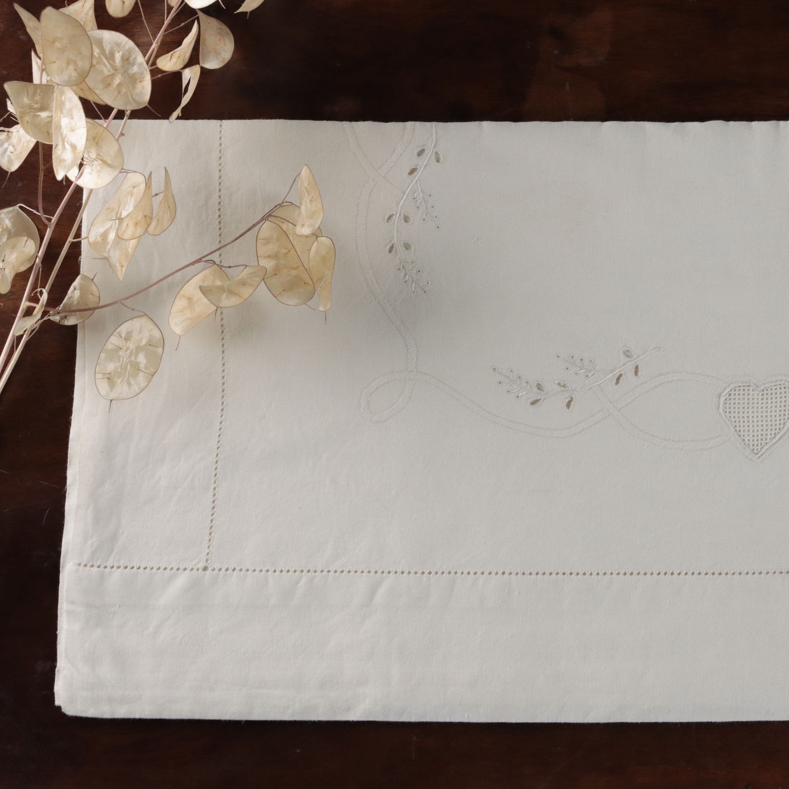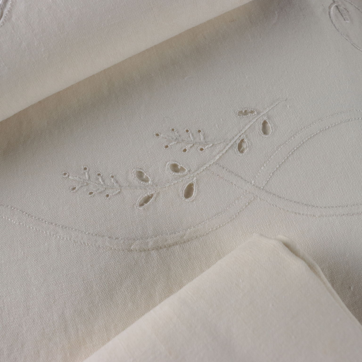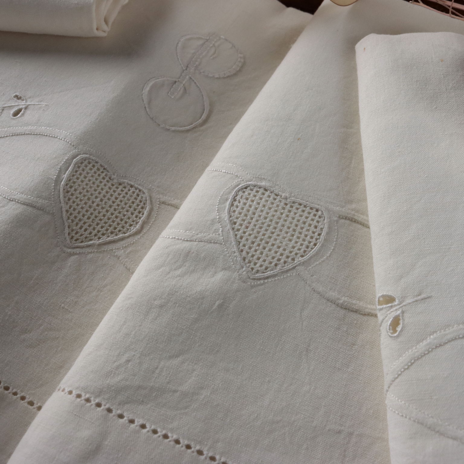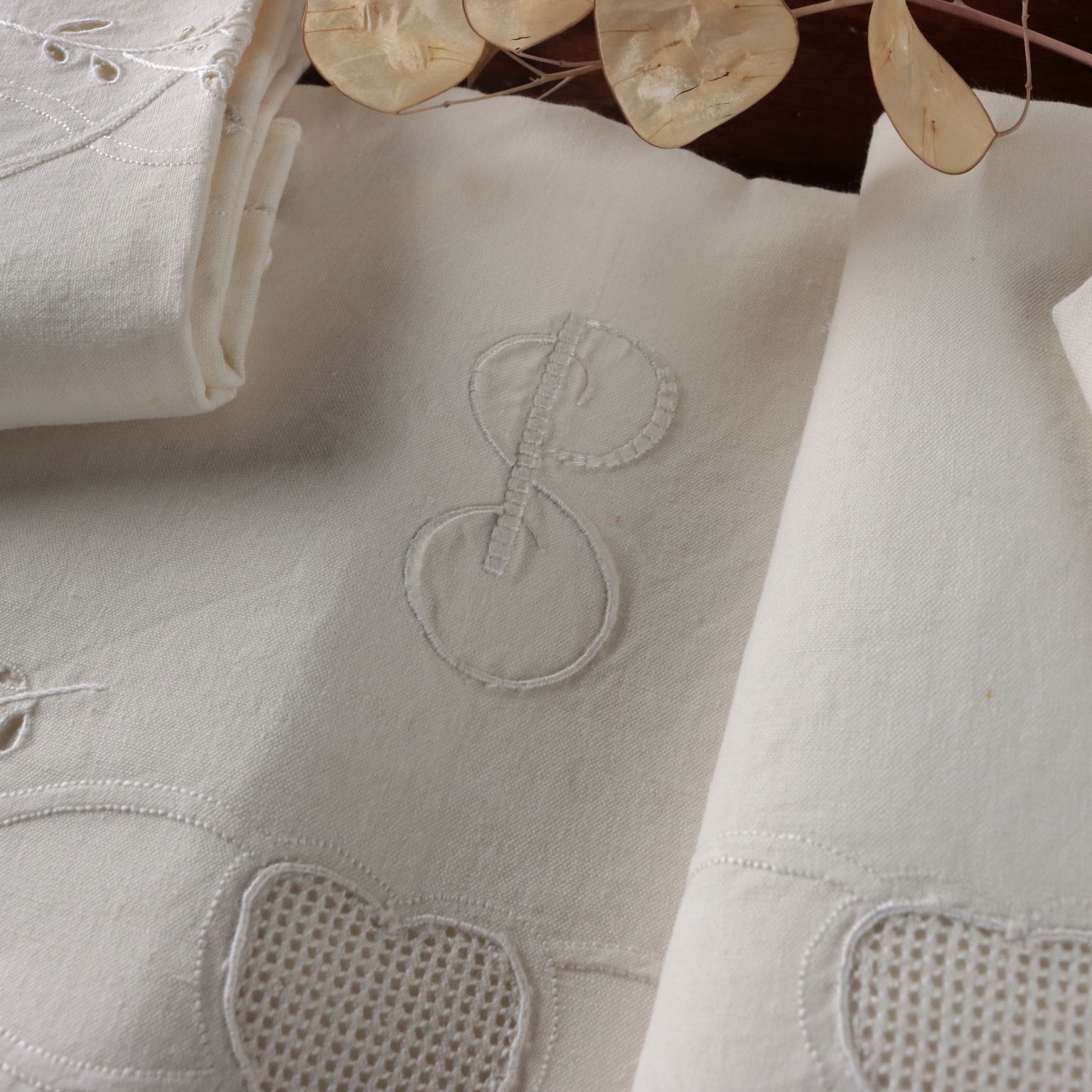 Completo matrimoniale con due federe Raffinata la reversina ricamata in punto pieno, punto rodi, punto ombra, punto intaglio cifrata "SP" a tema floreale. Le due federe si chiudono con allacciatura a bottoni In alcuni punti sono presenti segni del tempo e lievi aloni. Colore bianco panna Composizione lino Dimensioni Lenzuolo cm 256 x cm 232 Federe cm 82 x cm 44