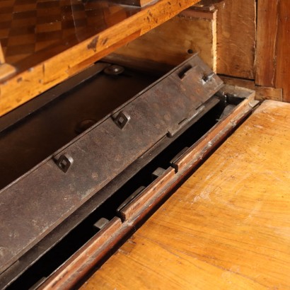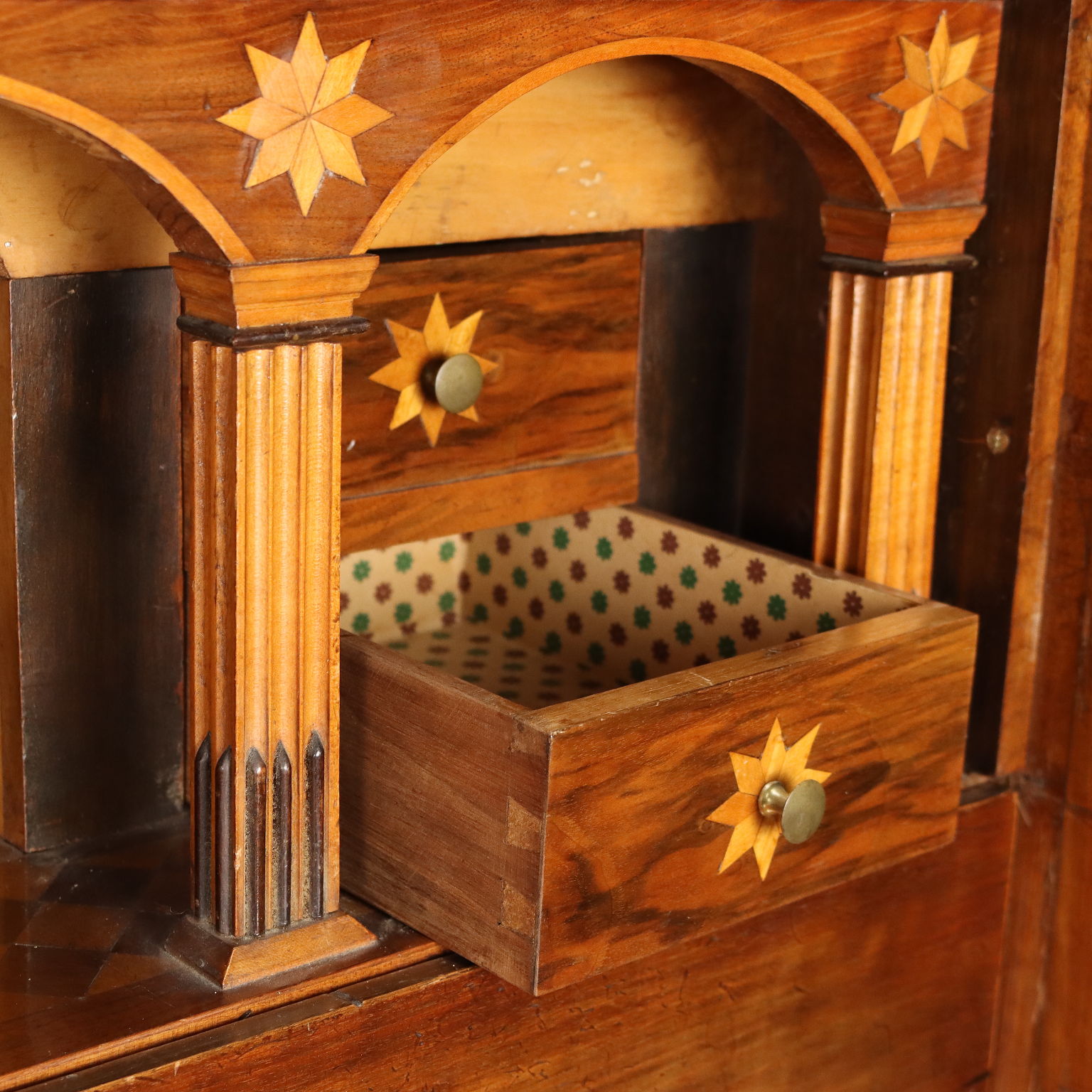Secrétaire Luigi Filippo sorretto da piedini dei quali quelli anteriori torniti, sul fronte presenta tre cassetti, cassettino nella fascia superiore dalla caratteristica gola e grande anta apribile a ribalta, celante scarabattolo architettonico a ricreare porticato con vani, cassettini e grande cassetto, sotto al quale si accede al vano segreto inferiore. In noce, interni in noce, lo scarabattolo è abbellito con flettature e intarsi in acero.