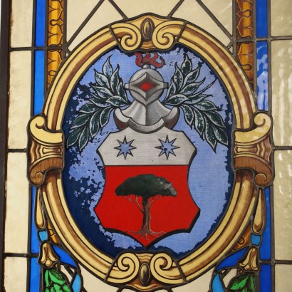 Coppia di vetrate Liberty con vetri piombati e colorati, lavorati a creare motivi decorativi a festoni floreali; al centro si trova stemma con albero sormontato da due stelle.