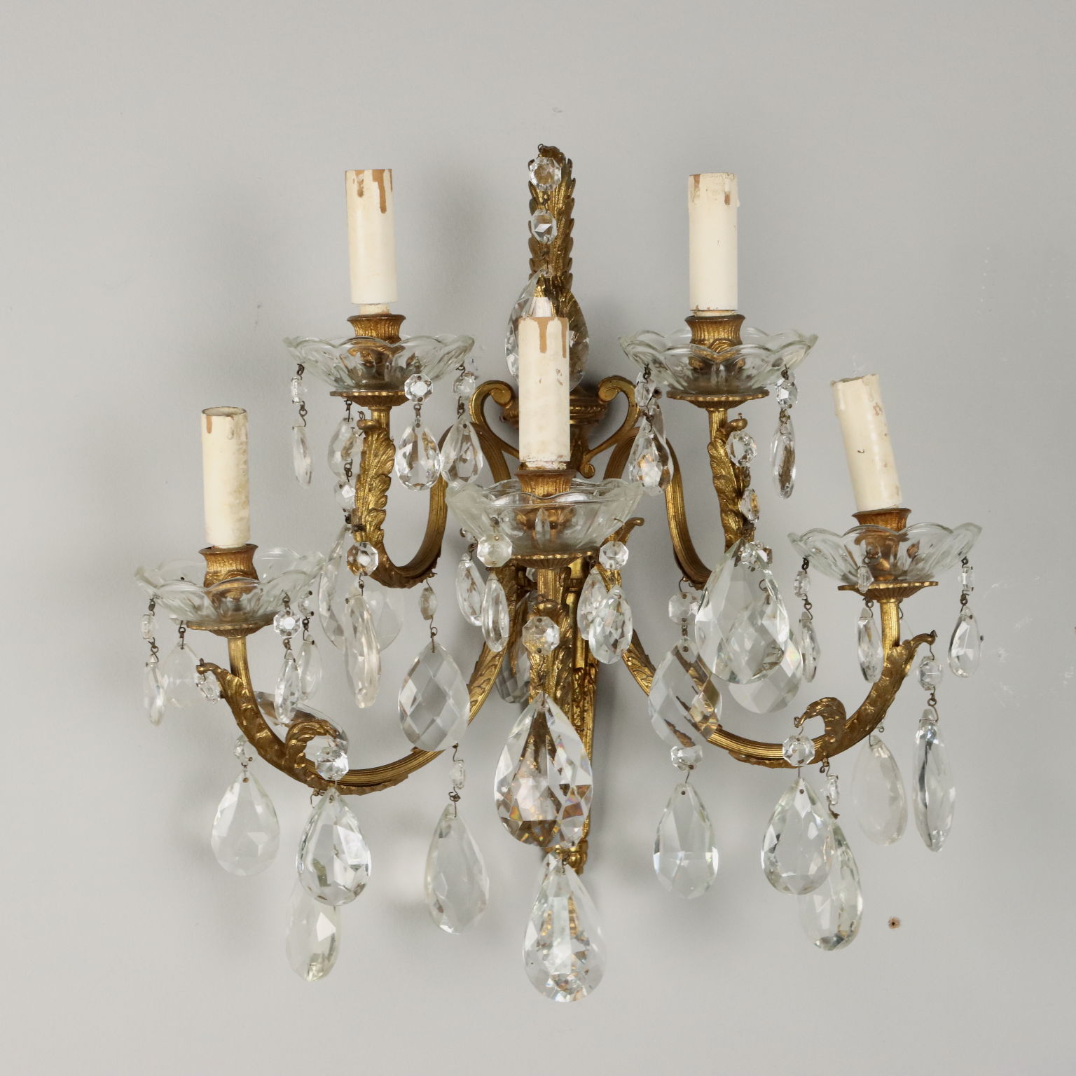 Tris di applique a cinque luci, in bronzo dorato lavorato con motivi di gusto neoclassico; sono ornate con pendenti in vetro.