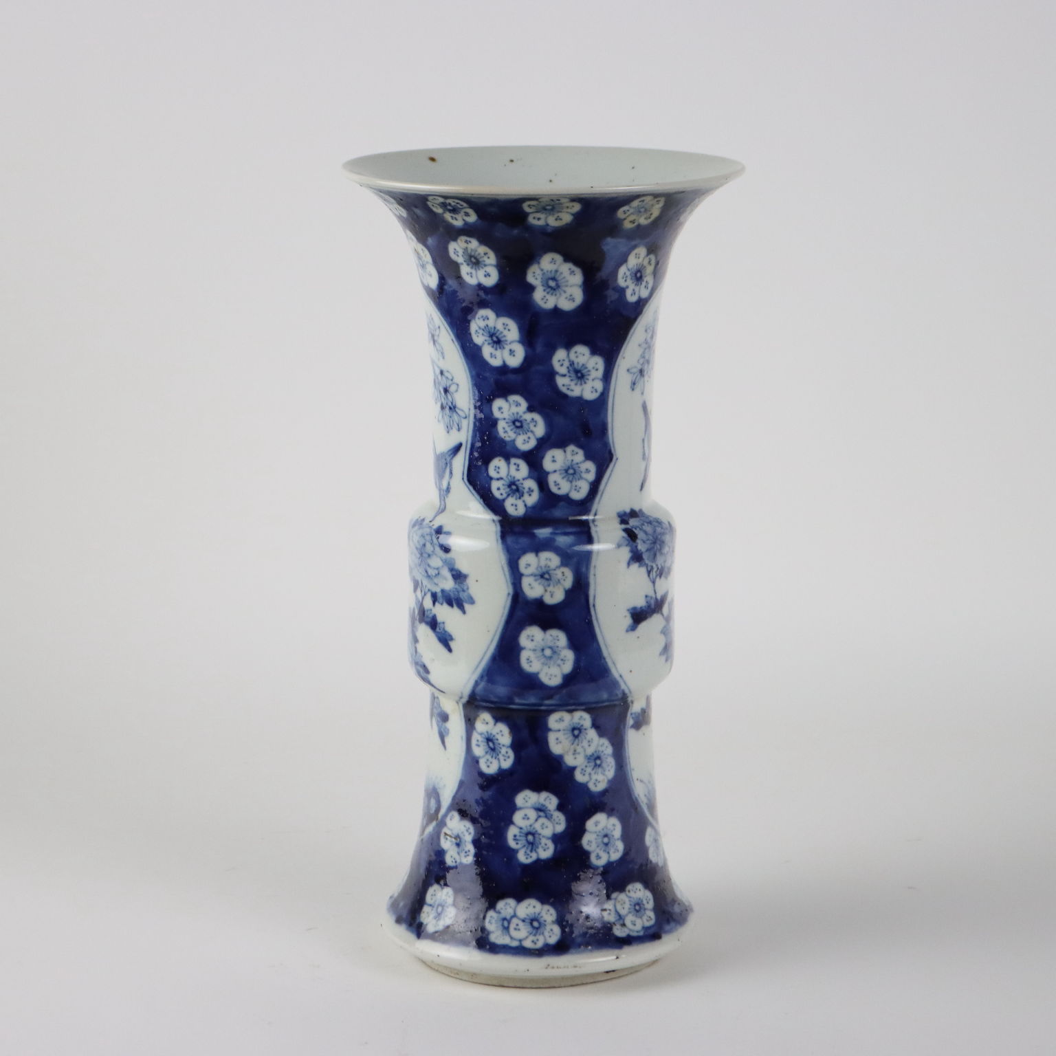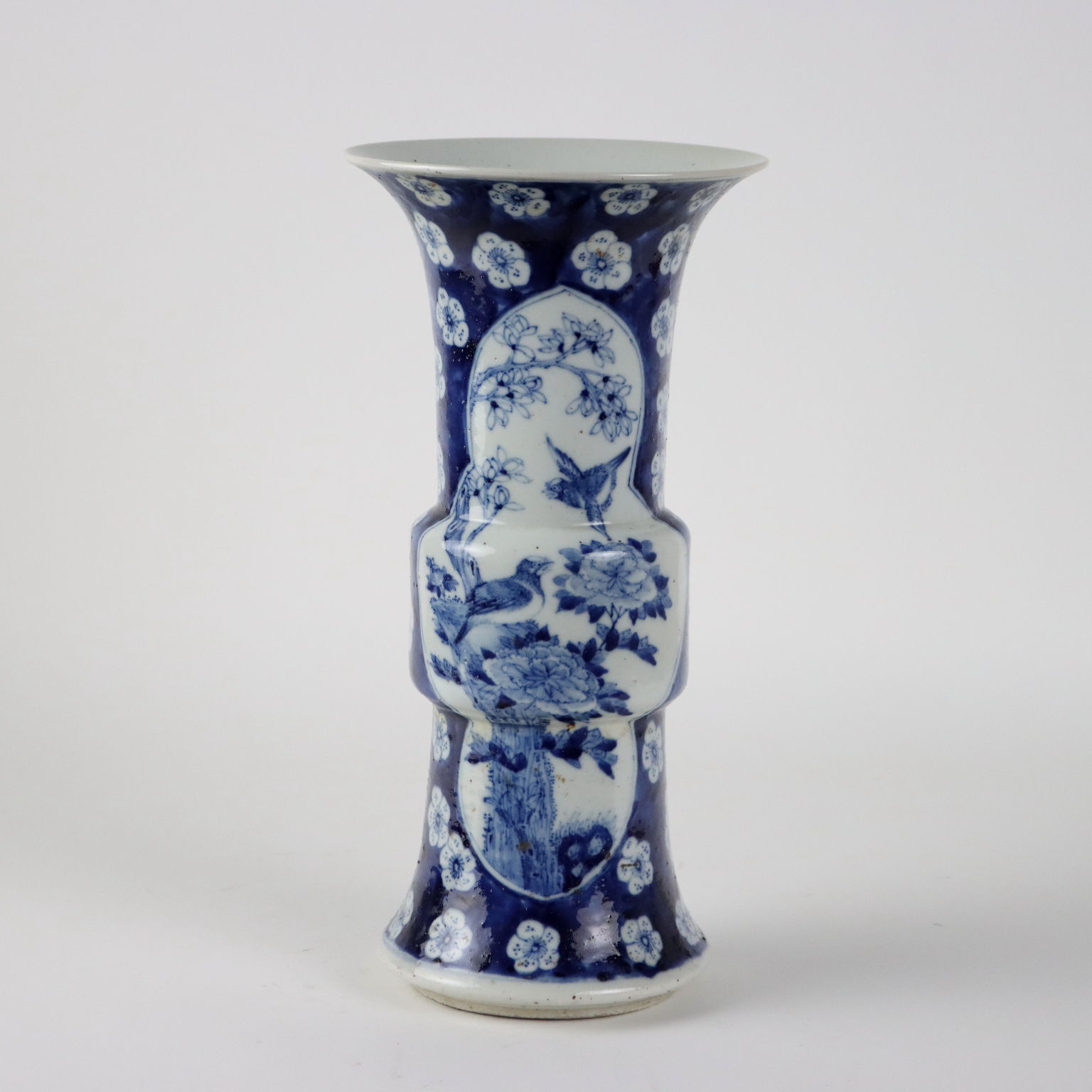 Vaso a forma di "Gu", a tromba, dipinto in blu sottocoperta e decorato con scene di uccelli su un tronco e fiori di peonia entro riserve polilobate, contro uno sfondo a fiori di ciliegio. Marchio apocrifo Kangxi a quattro caratteri sotto la base.