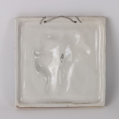 Piastra da parete in ceramica smaltata raffigurante coppia di ragazzi innamorati. Opera non firmata, attribuibile alla manifattura di Tarcisio Tosin.