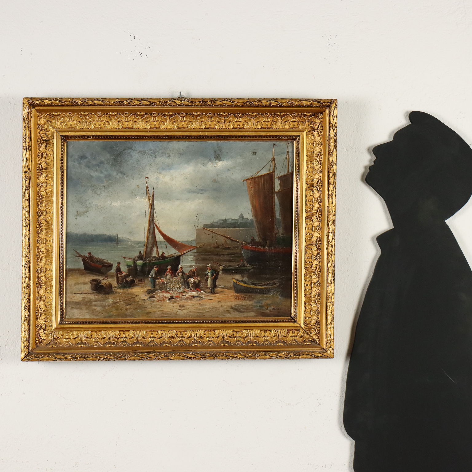 Olio su tela. Scuola inglese di fine '800. Presente una firma non identificata ( ... Henry) in basso a destra. Il dipinto propone un paesaggio marino animato al centro da un folto gruppo di figure, pescatori che con l'aiuto delle loro donne, selezionano il prodotto della loro pesca. Di contorno, le loro barche, sullo sfondo la cittadina che si affaccia sull'insenatura. Il dipinto necessita di pulizia e presenta qualche piccola caduta di colore; al retro presenti alcuni rattoppi. E' presentato in cornice coeva ridorata.
