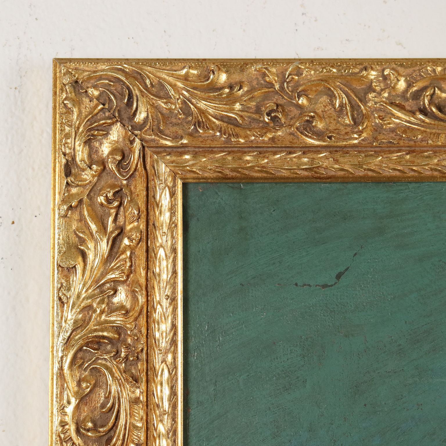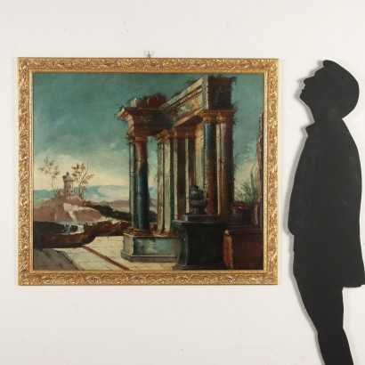 Olio su tela. Scuola nord-italiana del XVIII secolo. Secondo il gusto del XVIII secolo, il paesaggio proposto è dominato dai resti di un antico tempio, vestigia delle glorie passate. All'intorno una campagna con un corso d'acqua, ma sfumante in lontananza verso le cime azzurrate di una catena montuosa. Restaurato e ritelato, il dipinto è presentato in cornice in stile.