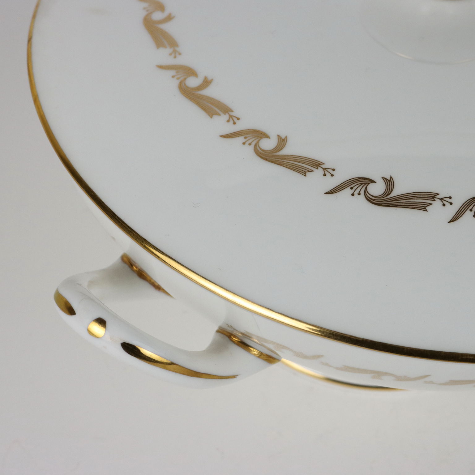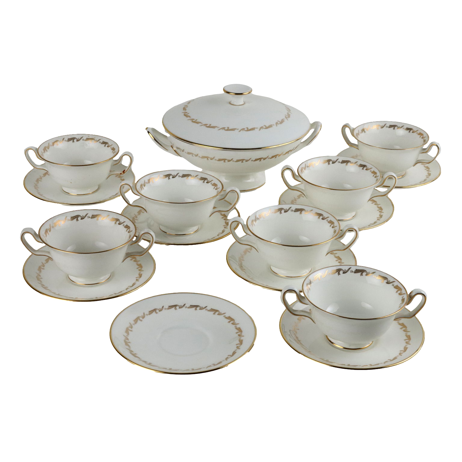 Servizio da consommè in porcellana composto da zuppiera, sette tazze e otto piattini, bordi e decoro a tema ripetuto in oro zecchino. Marchio della manifattura sotto la base.