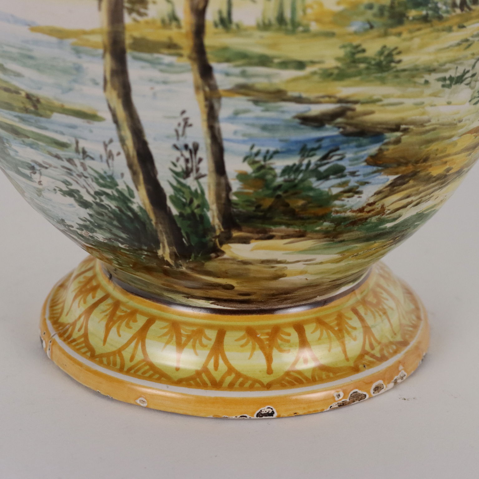 Vaso biansato in maiolica policroma con decoro a tutto campo raffigurante paesaggio rurale. Anse scenografiche con mascheroni e serpenti. Marchio della manifattura dipinto sotto la base.