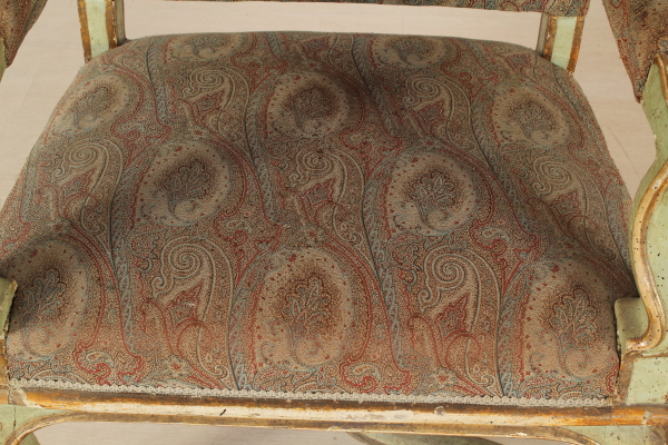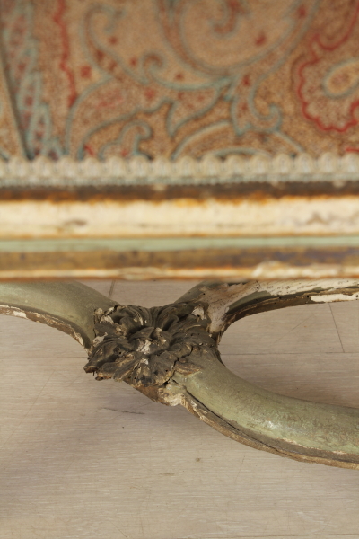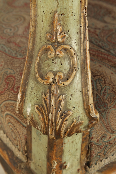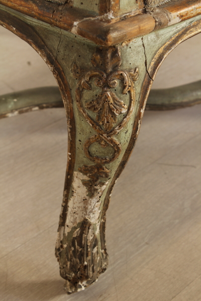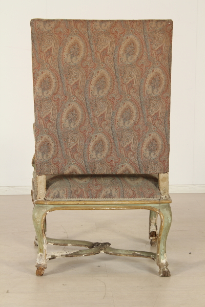 La poltrona presenta montanti e gambe mosse e intagliate con motivi a rilievo di gusto tipico dell'epoca. Crociera mossa in parte mancante con rosone centrale. La poltrona è Interamente laccata nei toni del verde e dorata a mecca nelle parti a rilievo. Schienale e seduta imbottite con stoffa non pertinente.