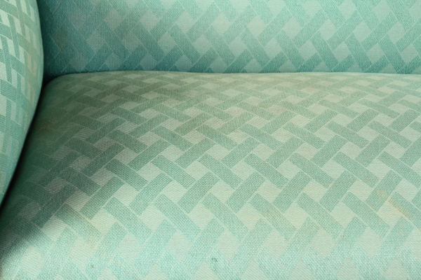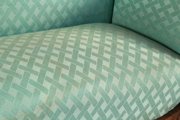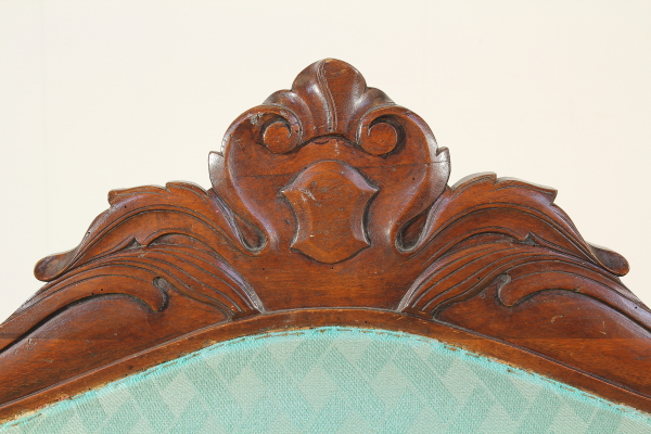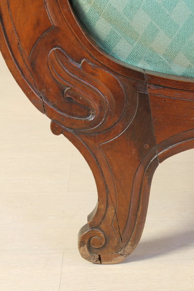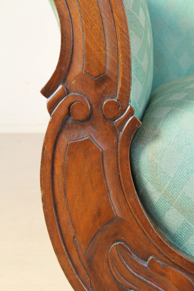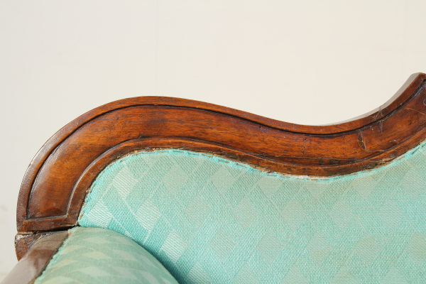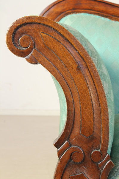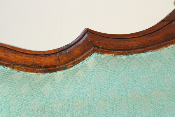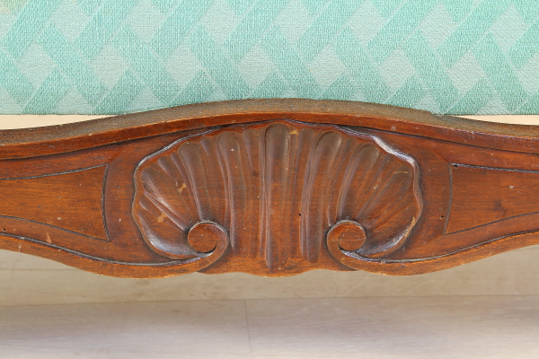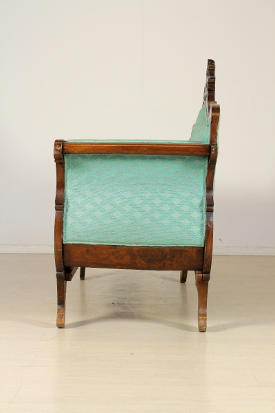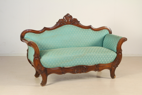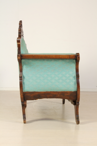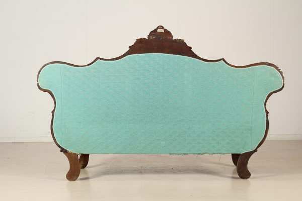 Divanetto "a barca" presenta parte lignea frontale mossa e intagliata. Schienale dalla linea mossa con cimasa intagliata. Sedute, braccioli e schienale intagliati.