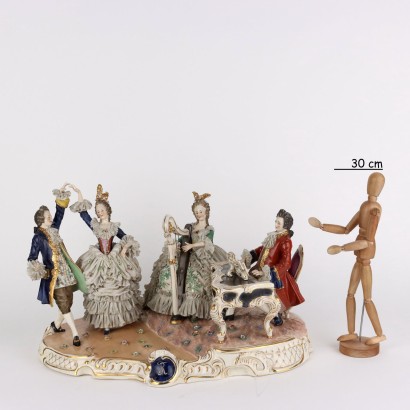 Gruppo scultoreo in porcellana di Capodimonte, raffigurante concertino con figure in abito settecentesco. Base a pavimento di forma ovale con bordo sagomato lumeggiato in oro. Marchio della manifattura di Capodimonte sulla base: "N coronata" in blu sottosmalto.