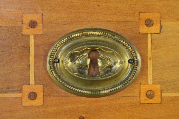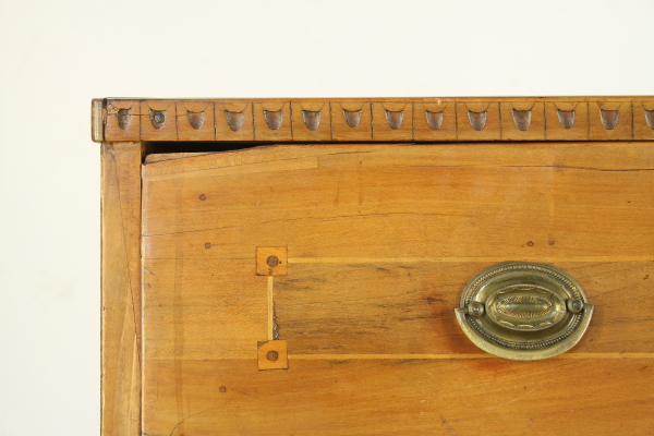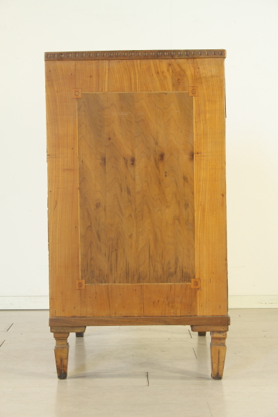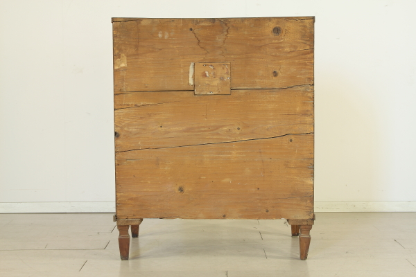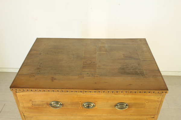 Cassettiera retta da piedi tronco-piramidali, presenta quattro cassetti. Cornice superiore e inferiore intagliata. Riserve intarsiate in lastrone di noce, acero e legno di testo. Centrino in parte con legname d'epoca. Ferramenta originale. Presenta modifiche e restauri.