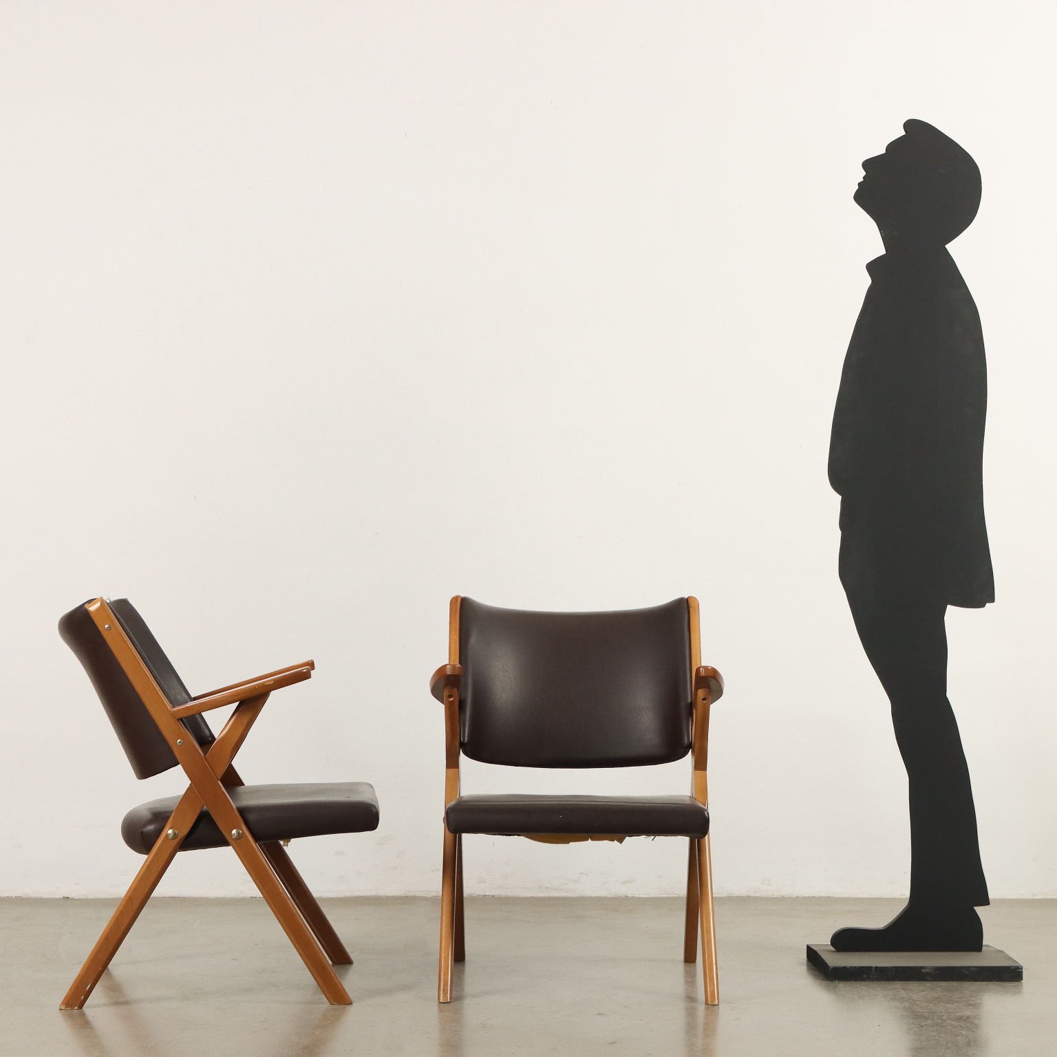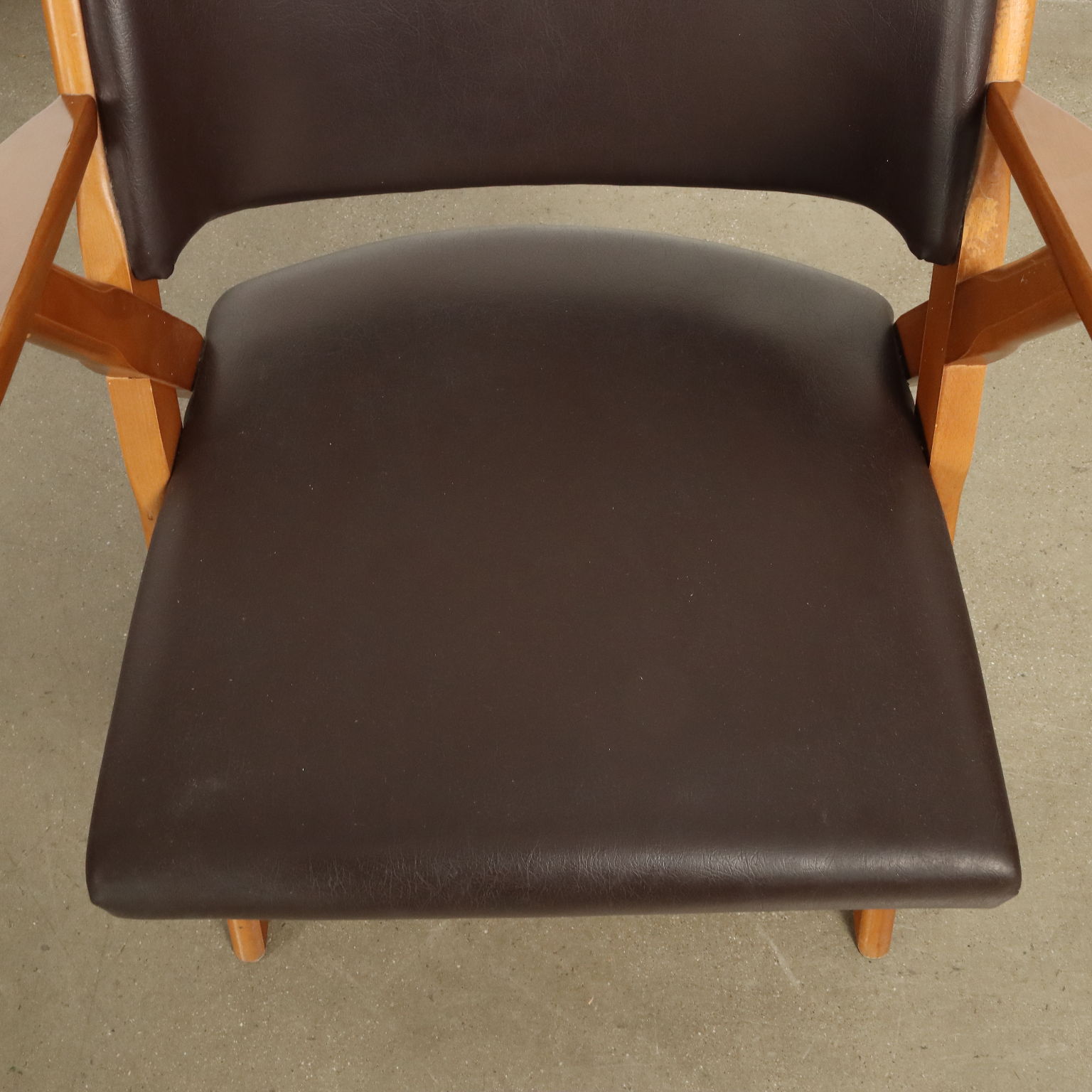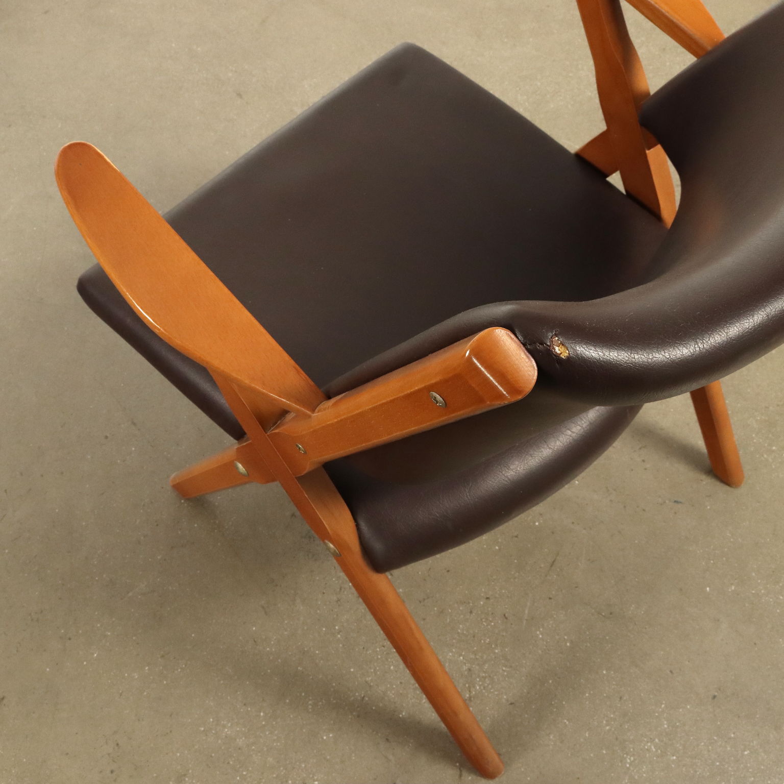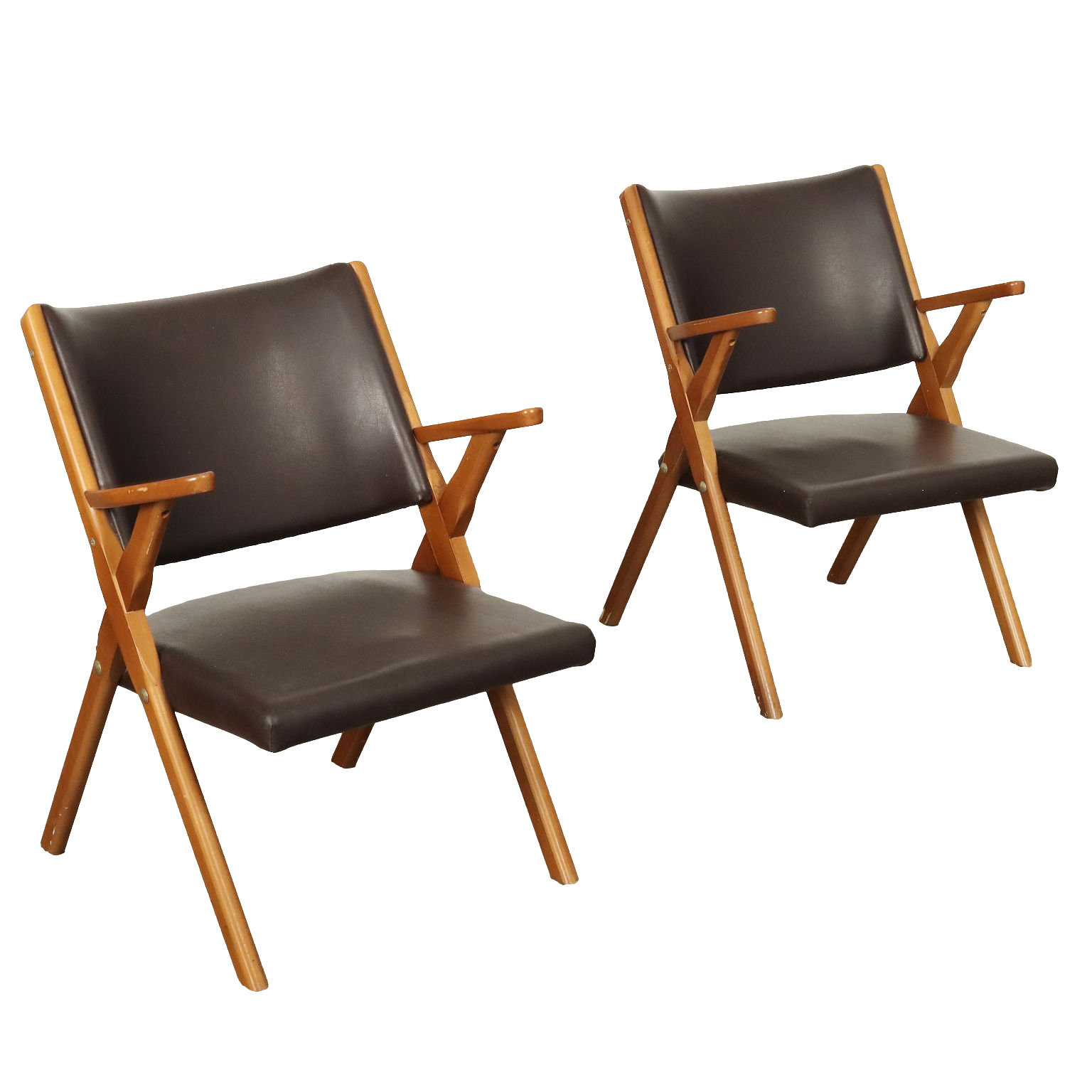 Coppia di poltroncine, imbottitura in espanso, rivestimento in skai, struttura in legno di faggio.