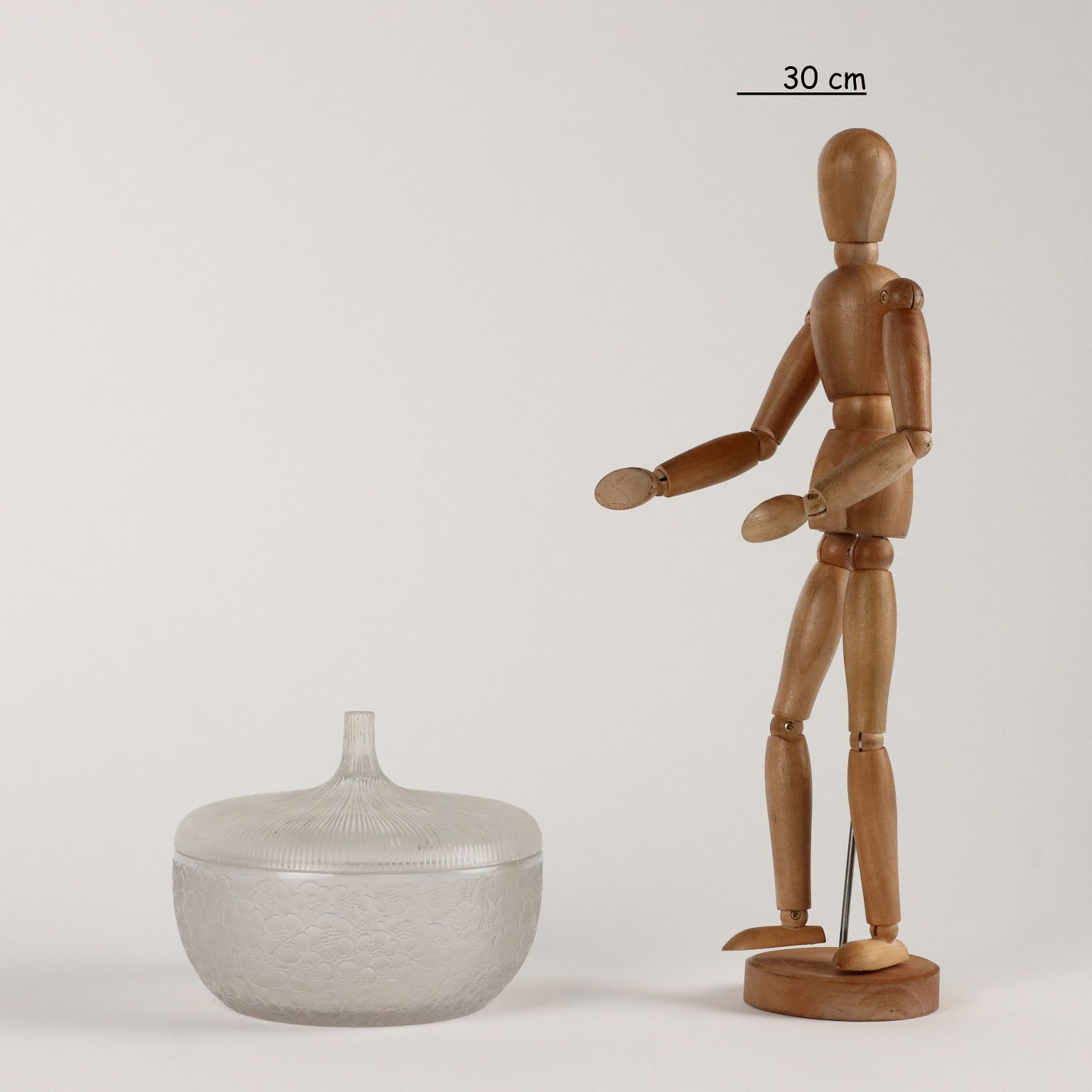 Scatola in cristallo di Lalique a forma circolare con decoro a fiorellini. Sotto la base firma a punta della manifattura.