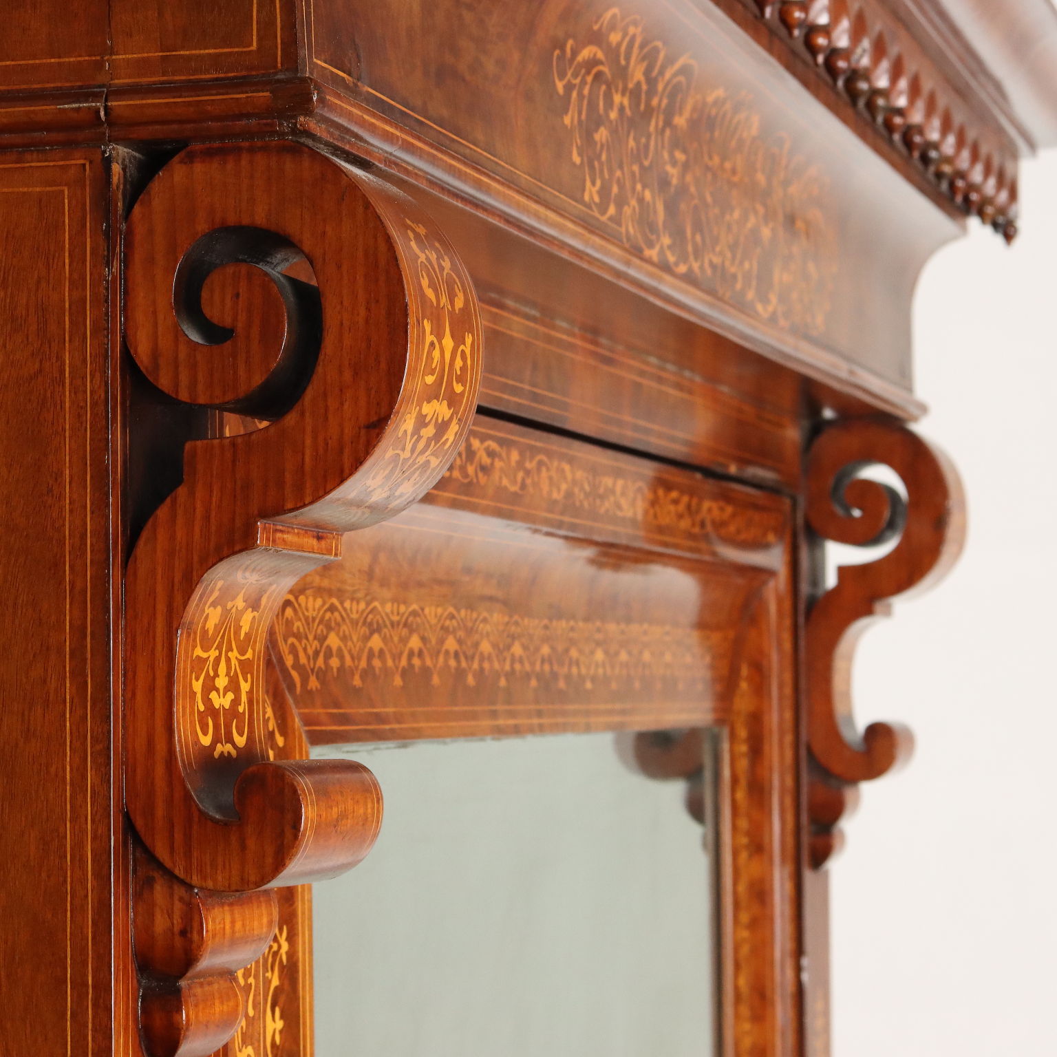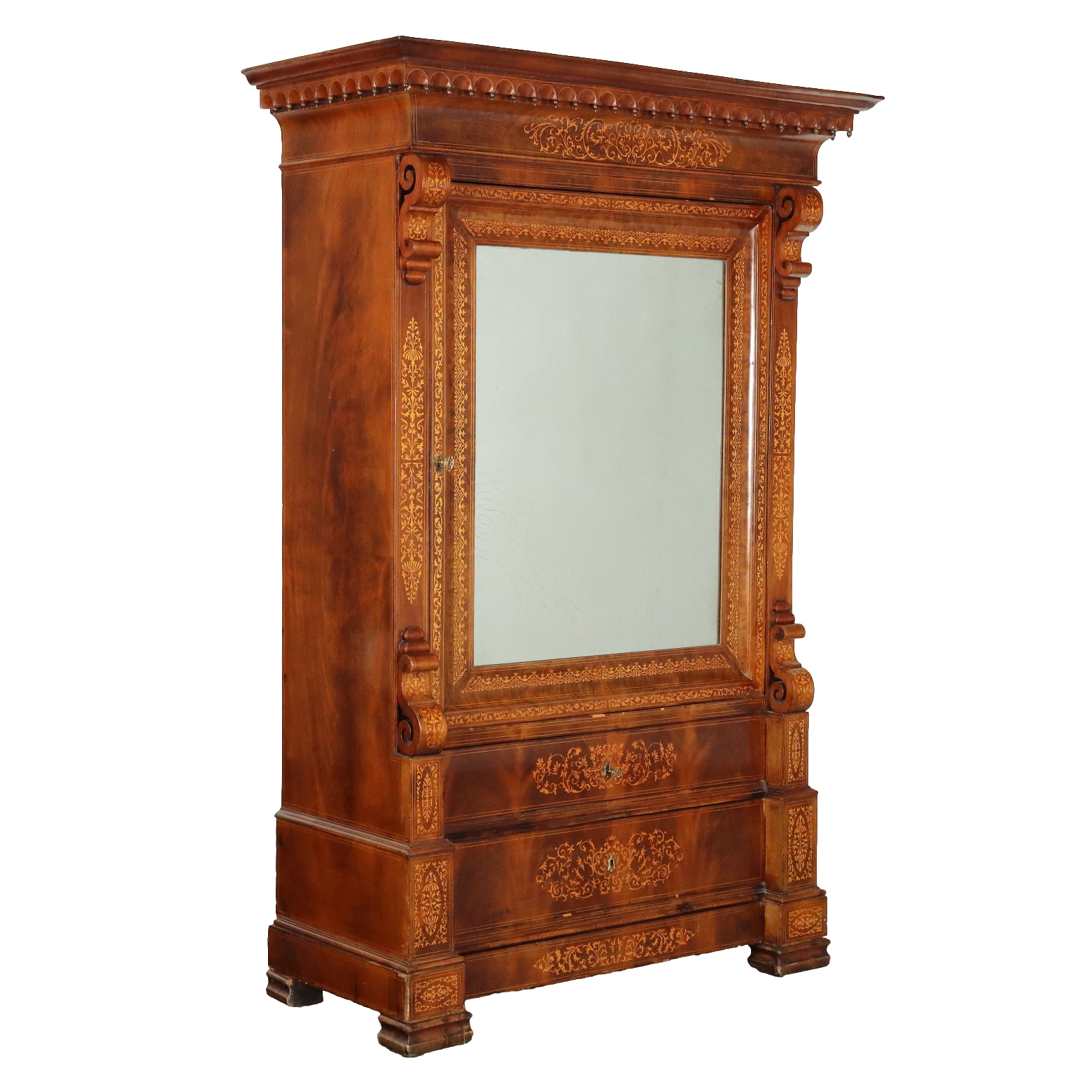Armadio Carlo X alla maniera di Girolamo Schmidt, lastronato mogano e parzialmente in piuma di mogano sul fronte, Napoli secondo quarto XIX secolo. Parte superiore intagliata con motivo ad archetti abbelliti da pinnacoli torniti, fronte con anta dotata di specchio al mercurio, montanti architettonici composti da lesene con mensole a ricciolo poggianti su plinti sovrapposti e tre cassetti nella sezione inferiore. Decorato interamente da filettature e sul fronte da intarsi fitomorfi calligrafici in acero. Realizzati in acero anche gli interni.