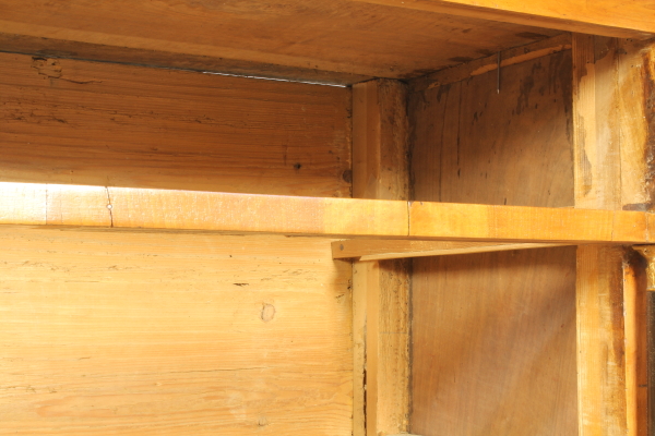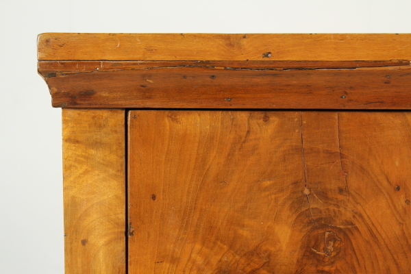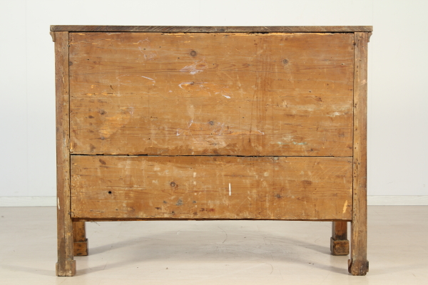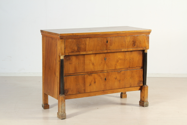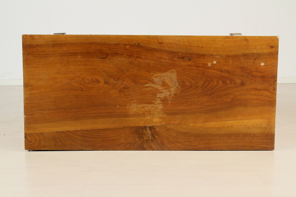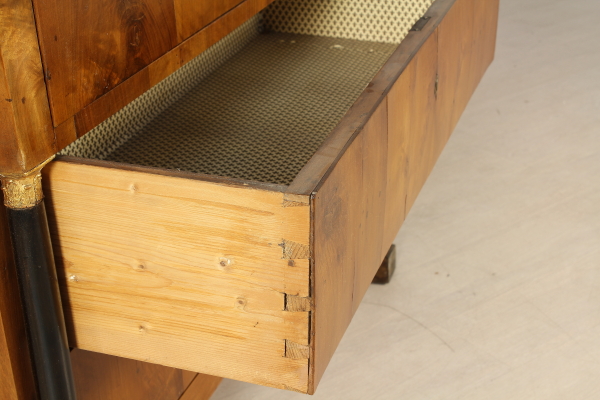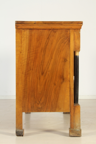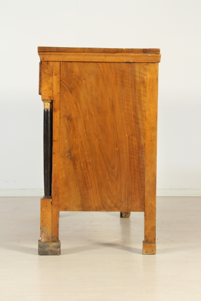 La cassettiera presenta tre cassetti. Montanti con colonne intere ebanizzate e capitello dorato terminano con piedi a plinto. Piano in noce massello.