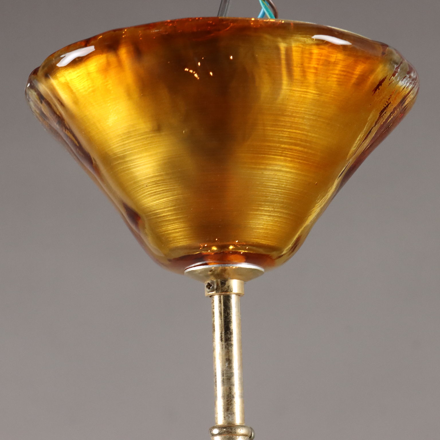 Elegante lampadario in vetro lavorato e modellato con sei bracci, presente il marchio della manifattura.