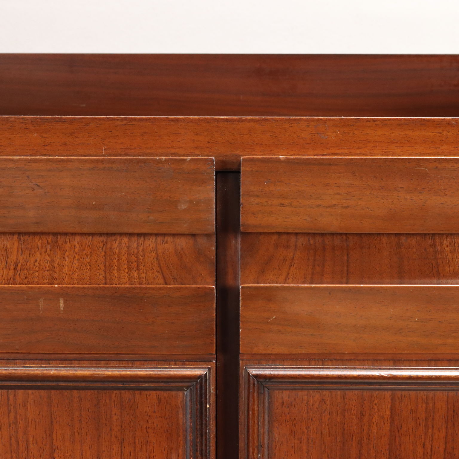 Descrizione Mobile ad ante battenti e cassetti a vista, alzata con mensola a giorno. Legno impiallacciato noce.