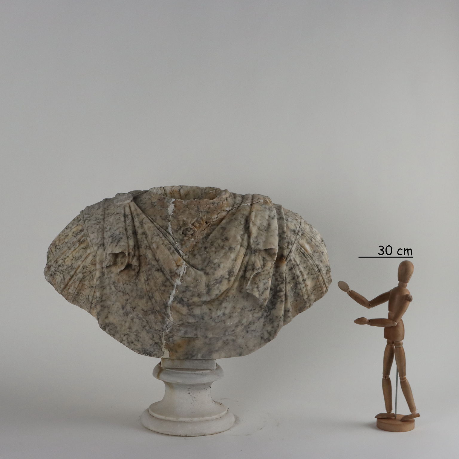 Busto tonacato acefalo, in marmo è poggiante su balaustro tornito.