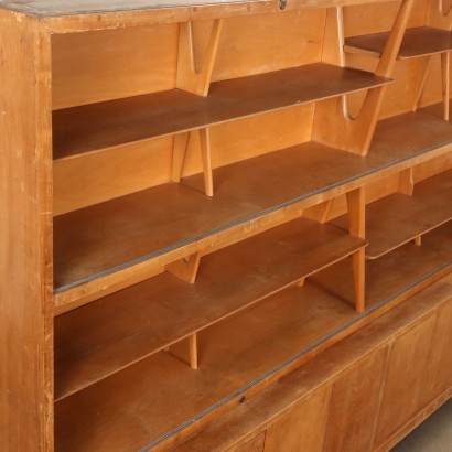 Mobile con parte inferiore contenitore con ante a libro, parte superiore a giorno, in origine prevede ante scorrevoli in vetro attualmente mancanti. Legno impiallacciato rovere e massello di faggio.