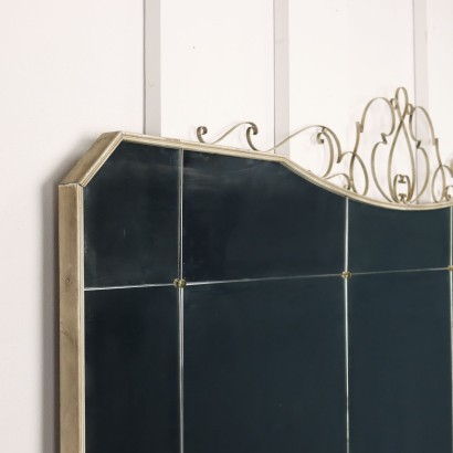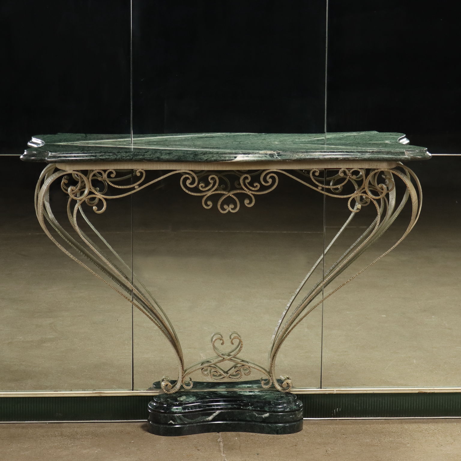 Specchiera con consolle, in ferro battuto, marmo verde, legno laccato e vetri specchiati. Restaurata.