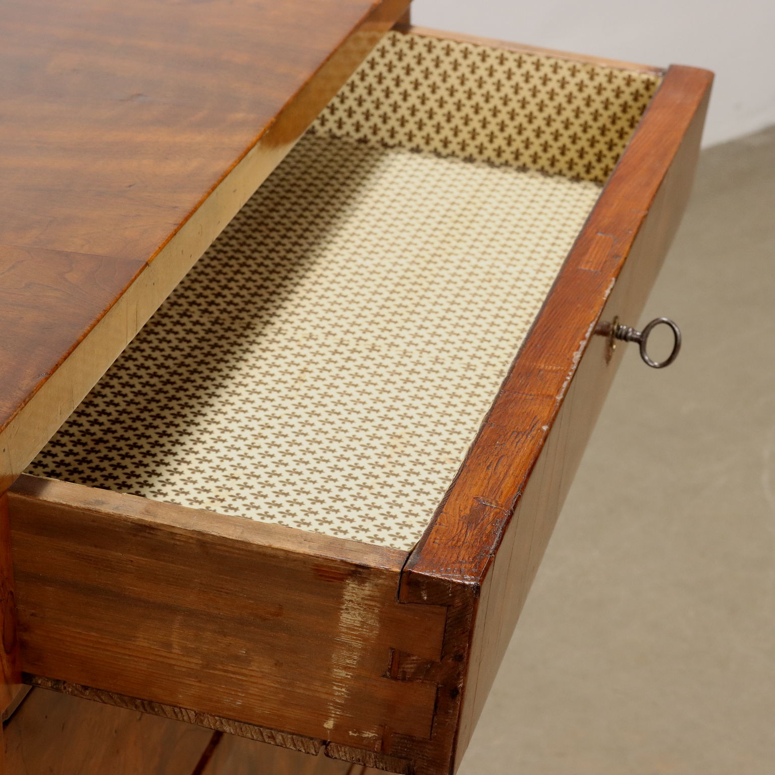 Comò sorretto da piedini, sul fronte presenta tre cassetti più uno dalle dimensioni inferiori posto sottopiano. Impiallacciato in radica di noce, gli interni sono in abete.