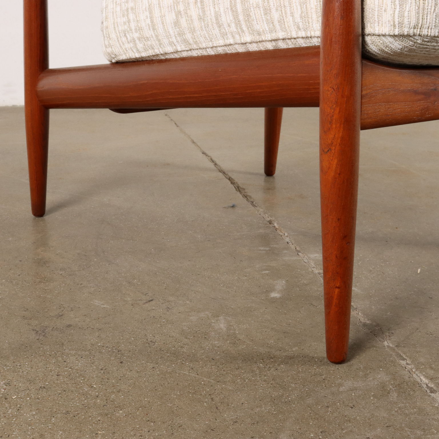 Poltrona in legno di teak, cuscini con molle e rivestimento in tessuto. Restaurata. Una poltrona adatta ad un ambiente con una zona relax con uno stile originale, un gusto di altri tempi e un tocco di eleganza. Il prodotto è stato accuratamente restaurato dal nostro laboratorio, con intervento di restauro sulla parte lignea e con la sistemazione dell'imbottitura e il rinnovo del tessuto.