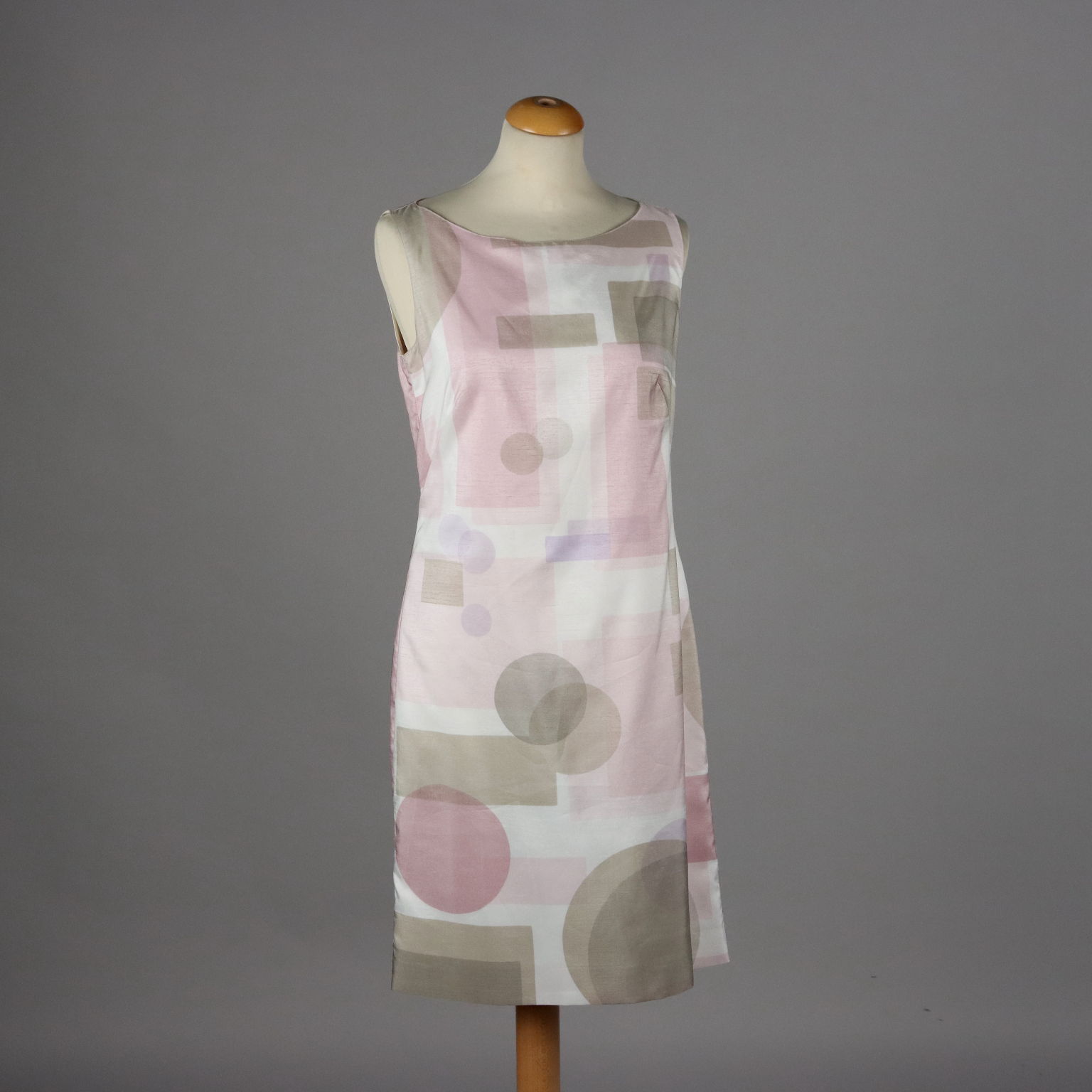 Abito da giorno con stampa geometrica, che richiama gli anni '60, nei colori tenui del rosa, lilla, bianco e beige. Zip sul retro. Foderato.