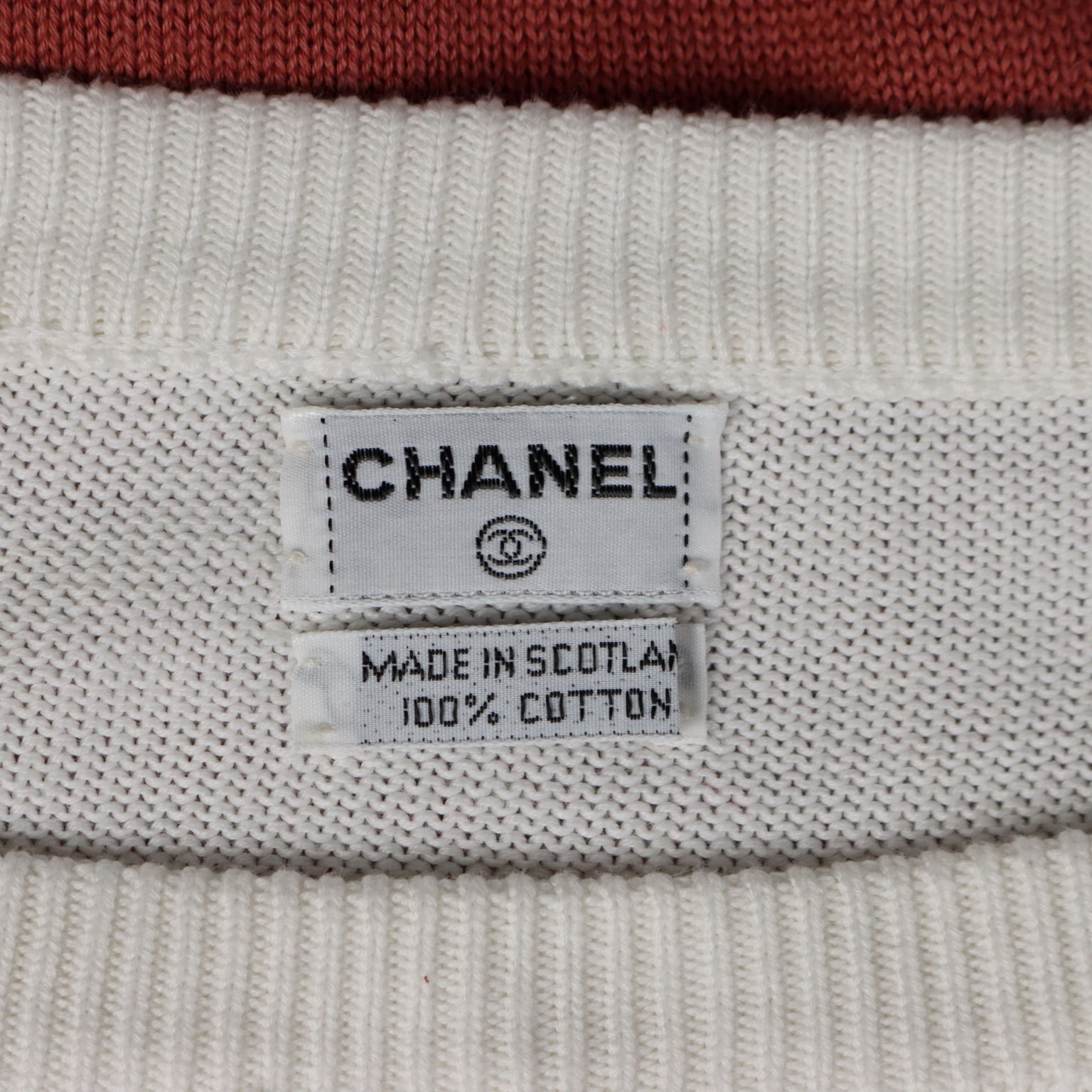 Maglione in puro cotone con scollo a barchetta, con corpetto bianco e mattone e maniche blu. Piccola tasca frontale con bottone. Presenta una piccola macchia di colore sul retro, che non compromette l'utilizzo del capo, il tessuto, infatti, è in ottime condizioni. La taglia non è riportata, specifichiamo alcune misure. Lunghezza manica: 60 cm. Larghezza spalle (da cucitura a cucitura, precisiamo che la spalla è scesa): 60 cm. Circonferenza torace: 98 cm. Altezza corpetto: 61 cm.
