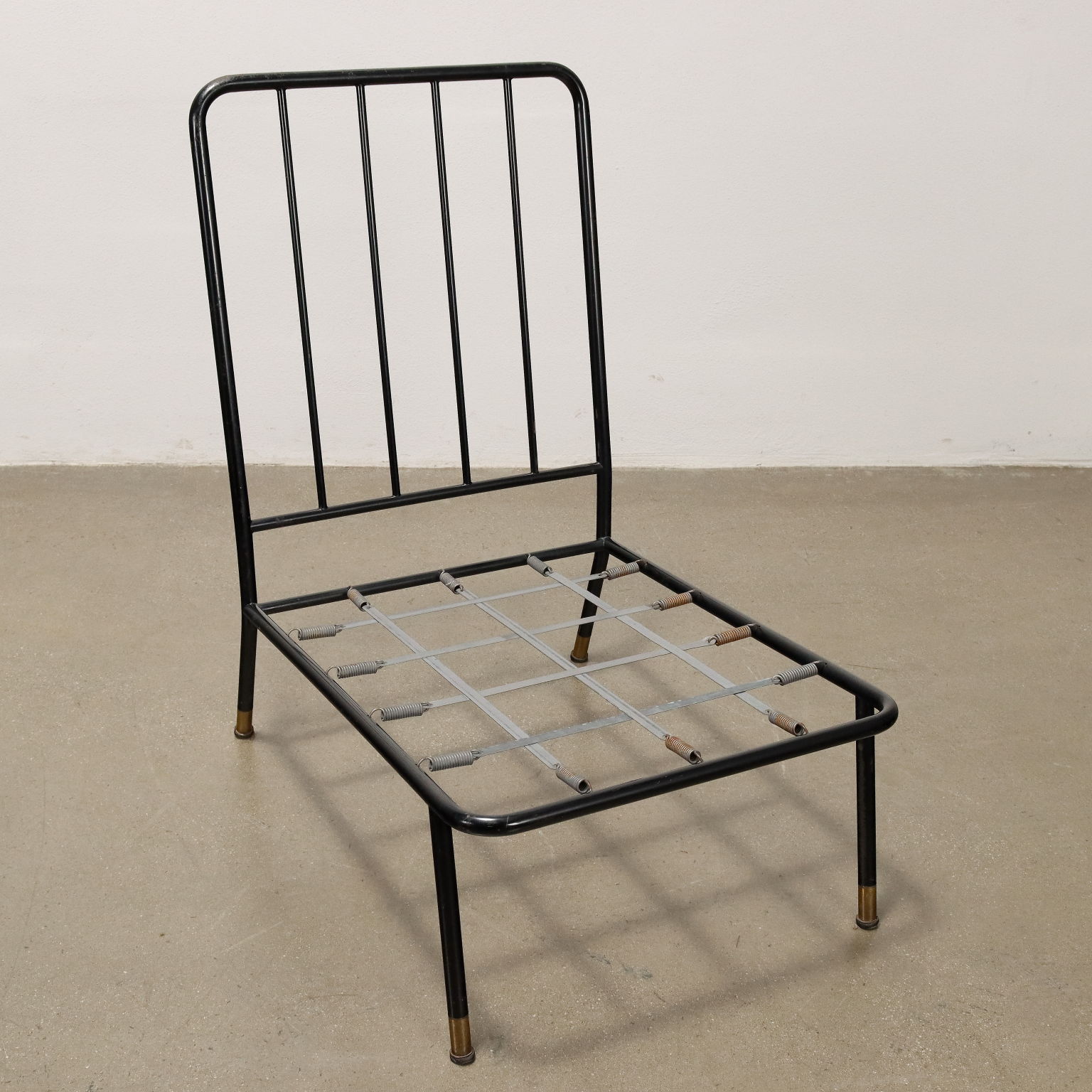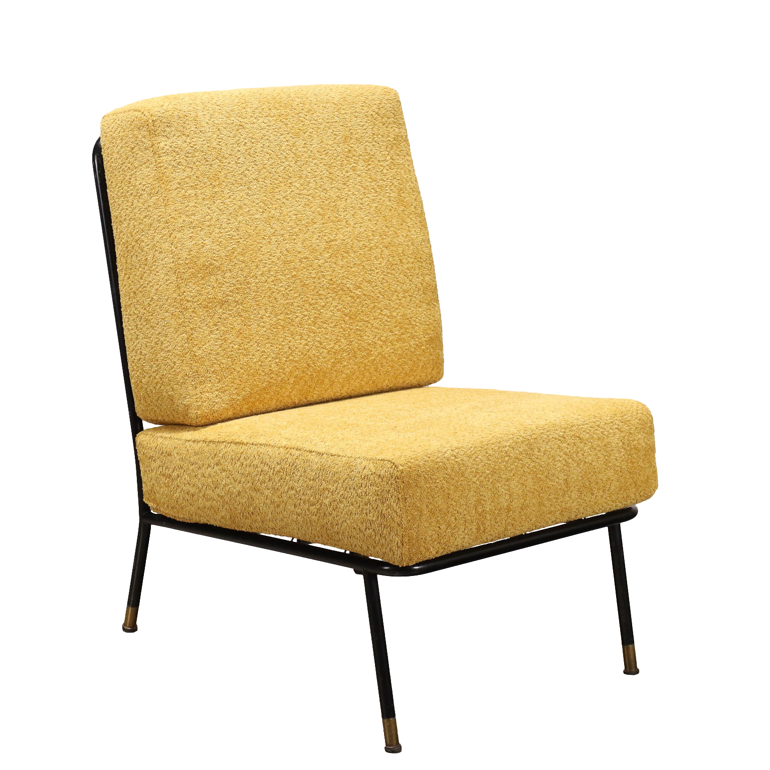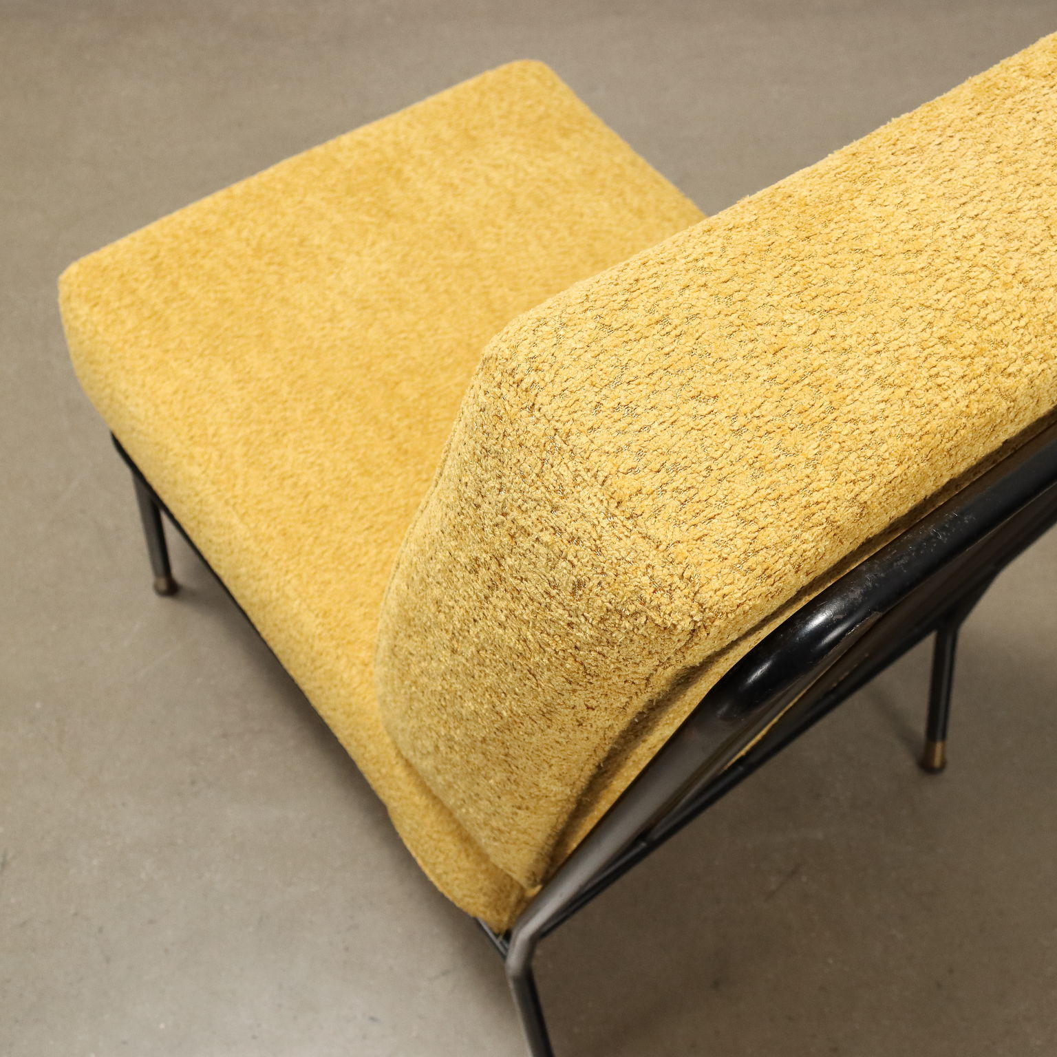 Poltrona tubolare in metallo smaltato con puntali in ottone, seduta e schienale in espanso con rivestimento in tessuto. Restaurata. Una poltrona adatta ad un ambiente con una zona relax con uno stile originale e un gusto di altri tempi. Il prodotto è stato accuratamente restaurato dal nostro laboratorio, con intervento di restauro con la sostituzione dell'imbottitura e del tessuto.