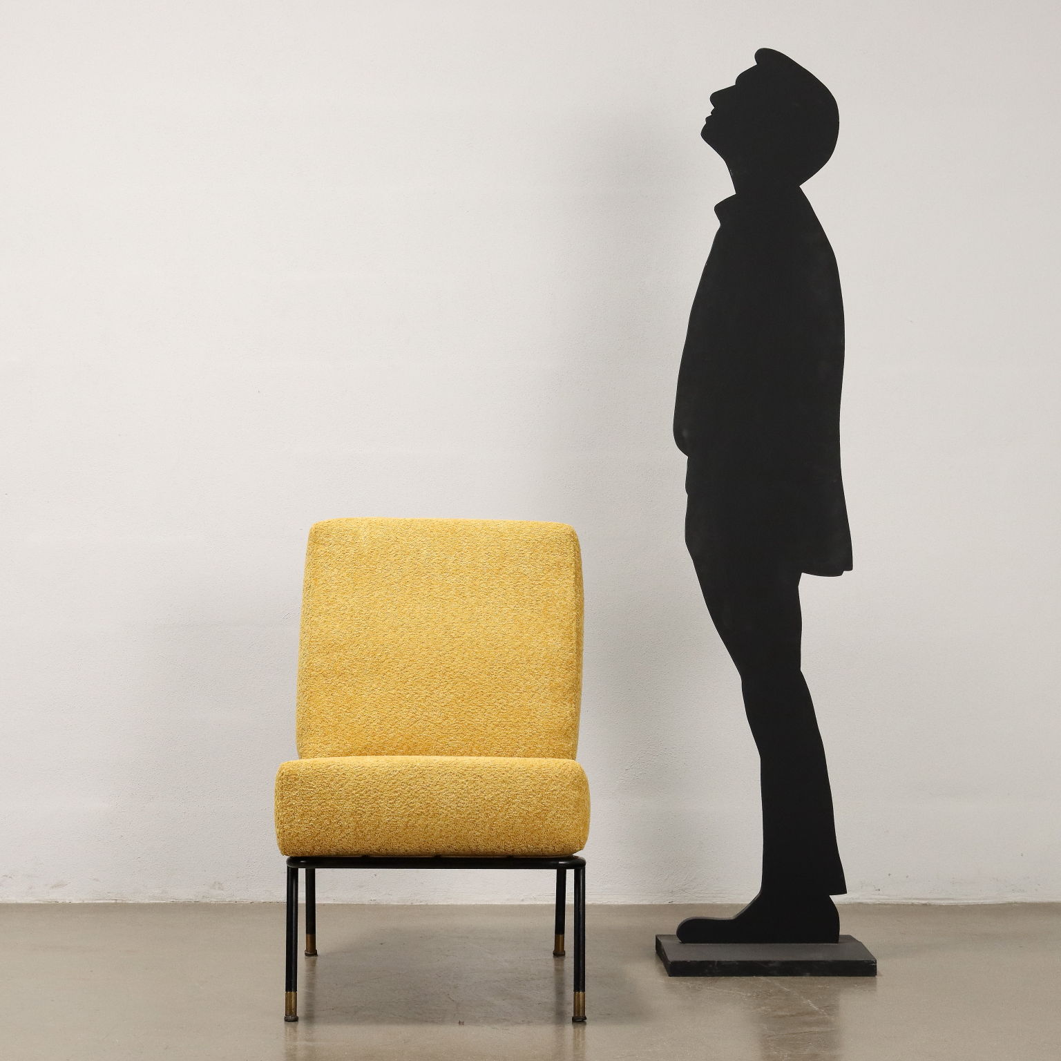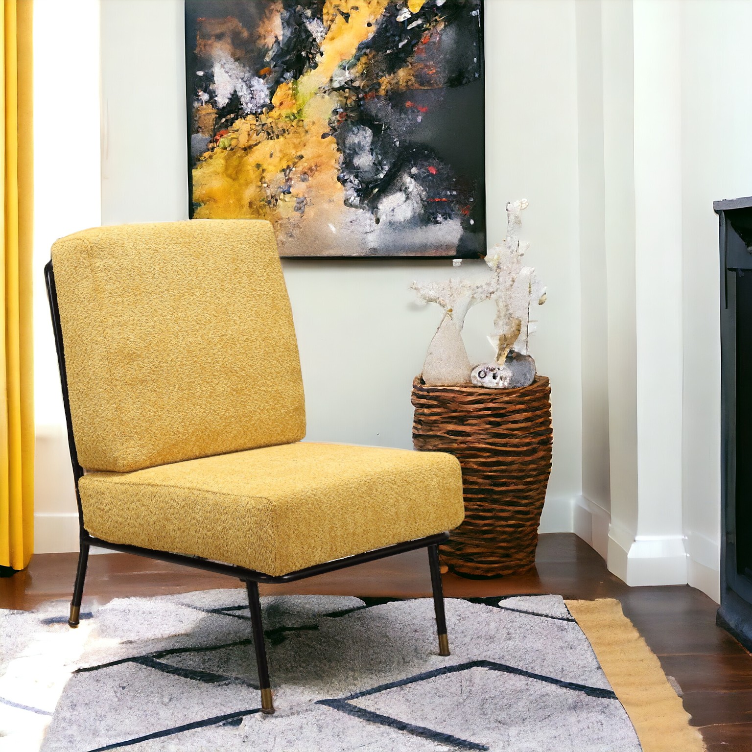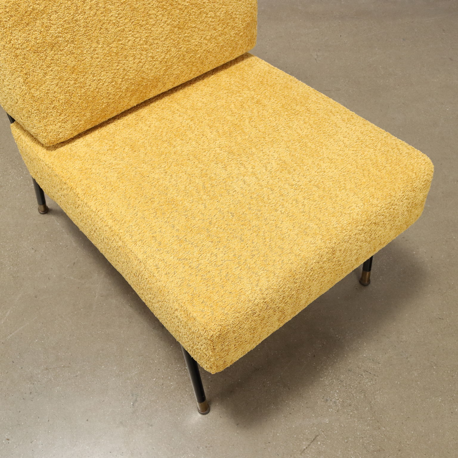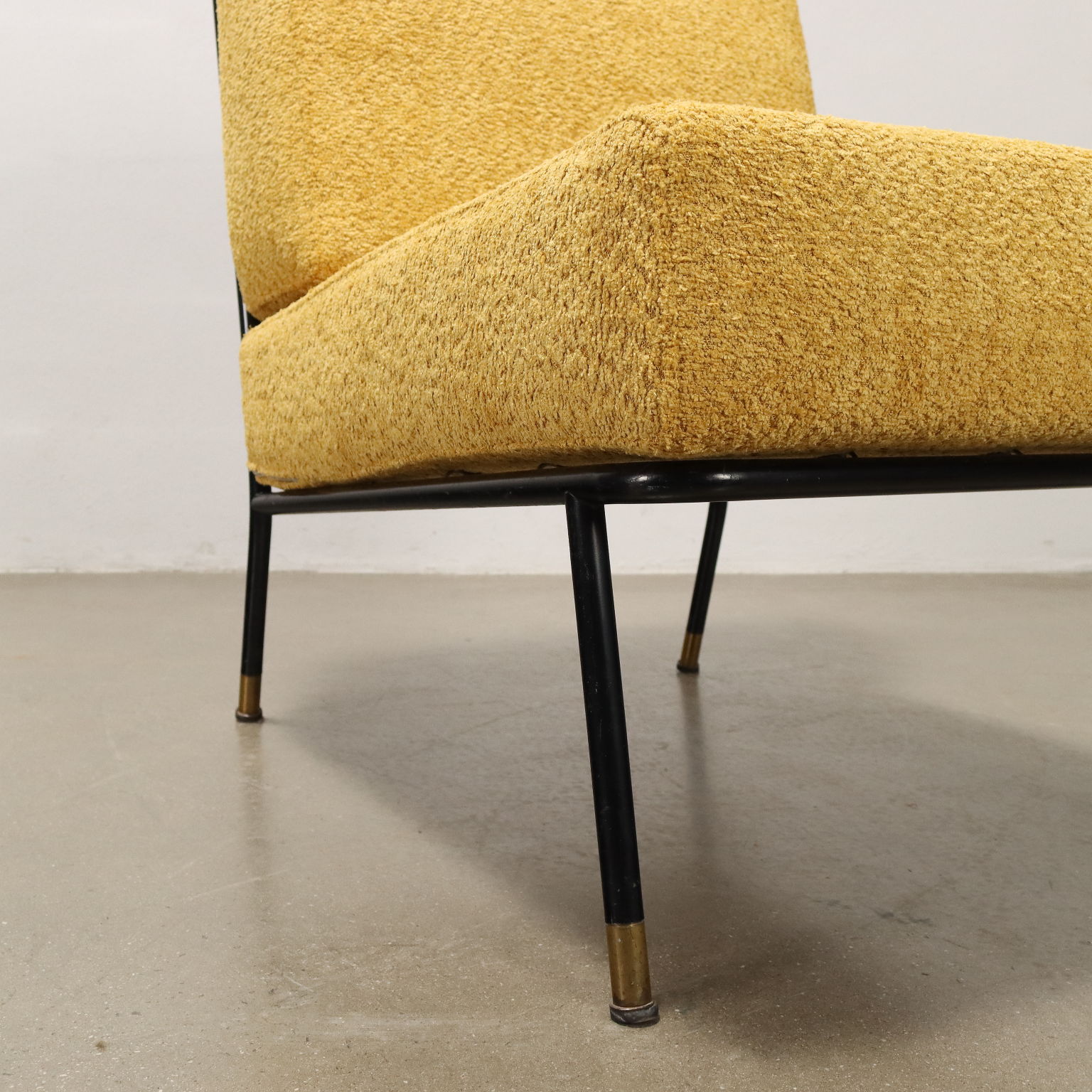 Poltrona tubolare in metallo smaltato con puntali in ottone, seduta e schienale in espanso con rivestimento in tessuto. Restaurata. Una poltrona adatta ad un ambiente con una zona relax con uno stile originale e un gusto di altri tempi. Il prodotto è stato accuratamente restaurato dal nostro laboratorio, con intervento di restauro con la sostituzione dell'imbottitura e del tessuto.