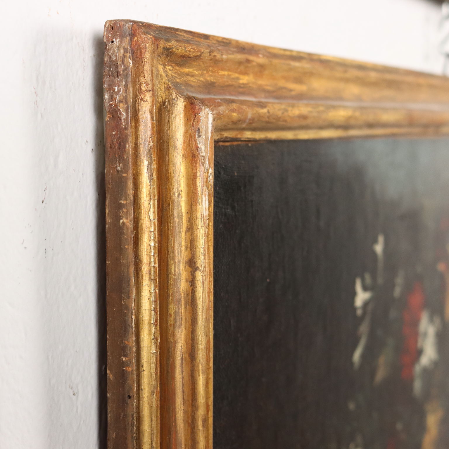 Olio su tela. Scuola veneta del XVII secolo. Sulle cornici sono apposte targhette attributive all'ambito di Elisabetta Marchioni , la pittrice originaria di Rovigo e attiva tra la fine del XVII e l'inizio del XVIII secolo, specializzata in nature morte di fiori e frutta. Le due composizioni sono caratterizzate da grappoli di fiori di diversi colori -in una tela un'unica varietà floreale, le peonie, in cromie diverse, nell'altra fiori differenti con una gamma più vasta anche di colori-, collocati in modo piuttosto disordinato su sfondi molto scuri, dominati dal nero, da cui emergono con la loro forza cromatica; in uno dei dipinti i fiori sono raccolti in un mazzo dentro un vaso color rame, nell'altro invece si intravvede un piatto in peltro e forse un sottile vaso, appena accennato, su cui si fiori sono appoggiati. I dipinti sono stati restaurati e ritelati. Sono presentati in cornice dorate di fine '800.