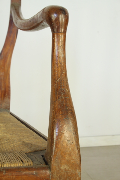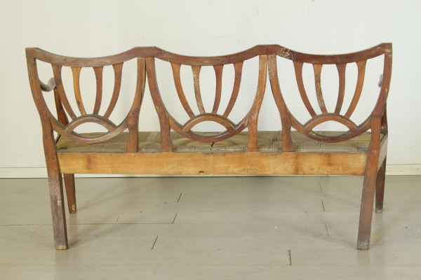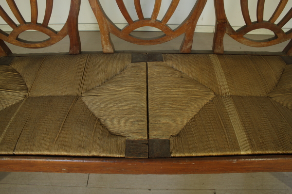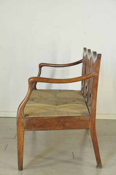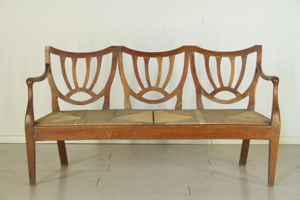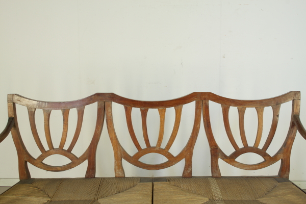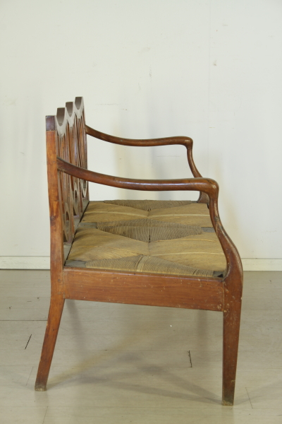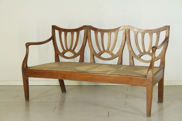 Divano retto da gambe tronco-piramidali presenta sedute in paglia. Schienale tripartito e braccioli a giorno dalla linea mossa.