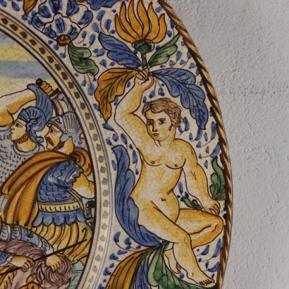 Piatto da parata in maiolica policroma a gran fuoco decorata alla maniera di Castelli. Decorato con scena di battaglia nel cavetto e putti e girali vegetali sulla tesa. La tesa è decorata anche sul retro con un motivo ad onde in azzurro. Al verso marchio con scudo e asterisco non identificato.