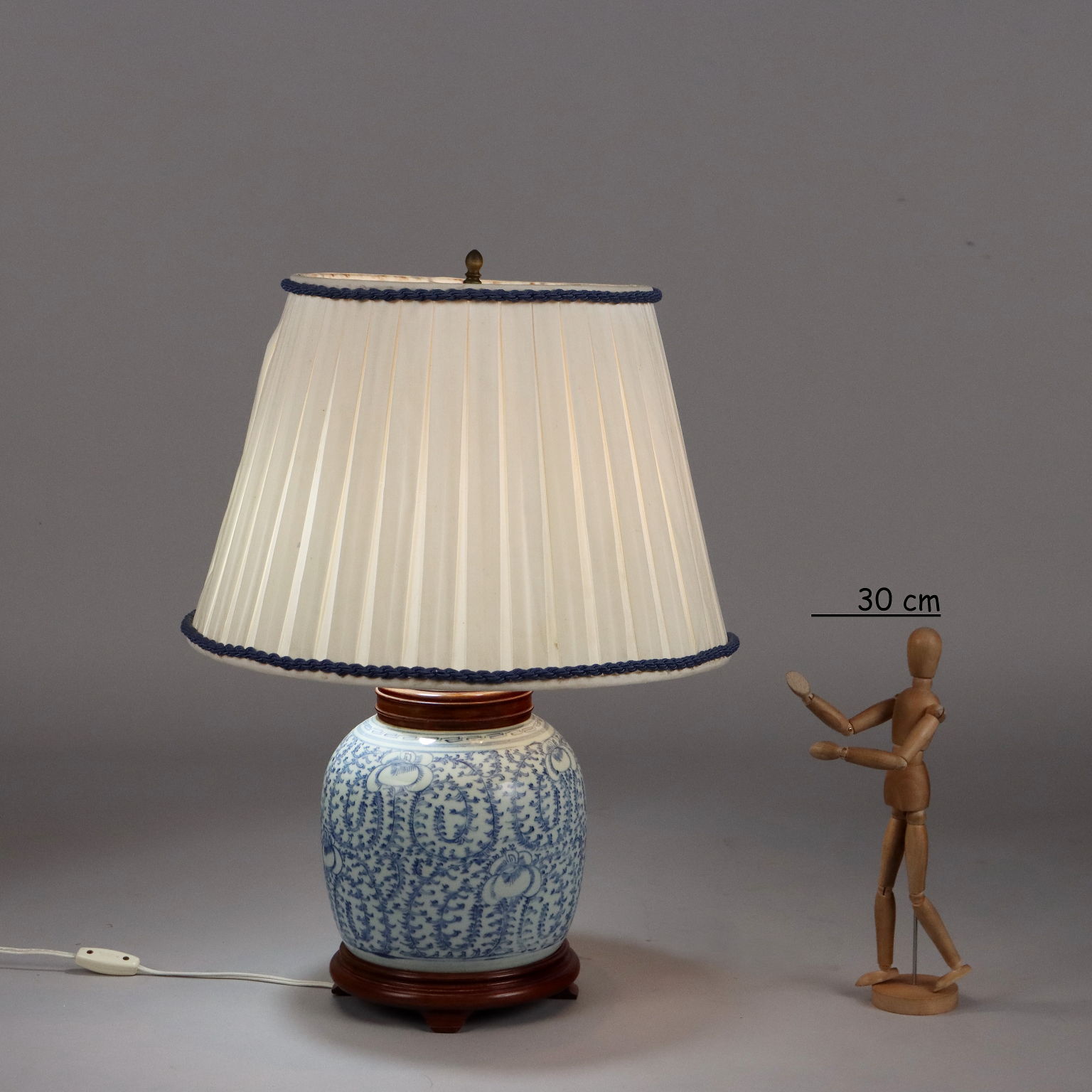 Lampada in porcellana decorata nei toni del blu a motivi vegetali. Montatura in legno e ottone dell'ultimo quarto del '900. Paralume in tessuto.