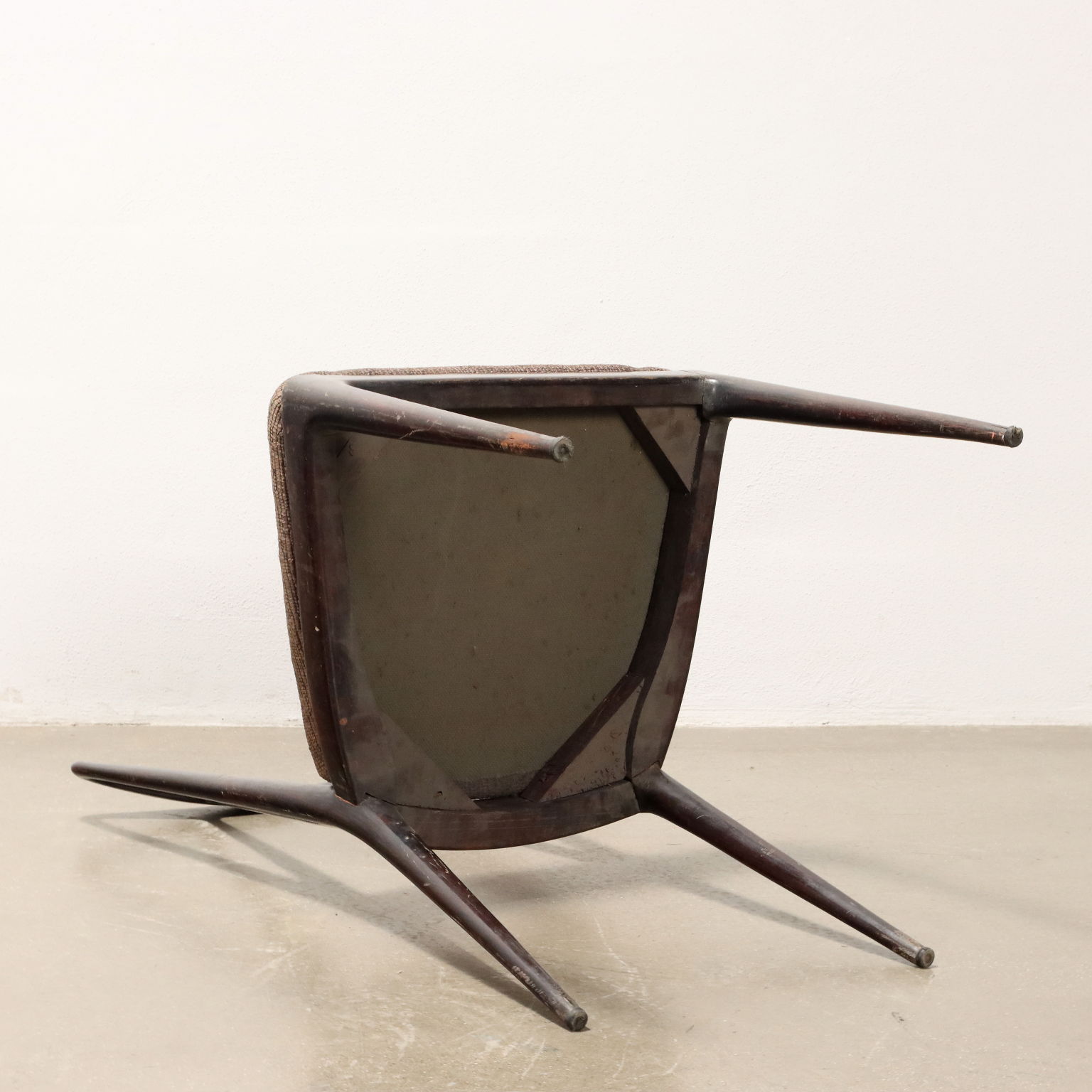 Coppia di sedie in legno di faggio tinto e imbottitura in espanso, rivestimento in tessuto.