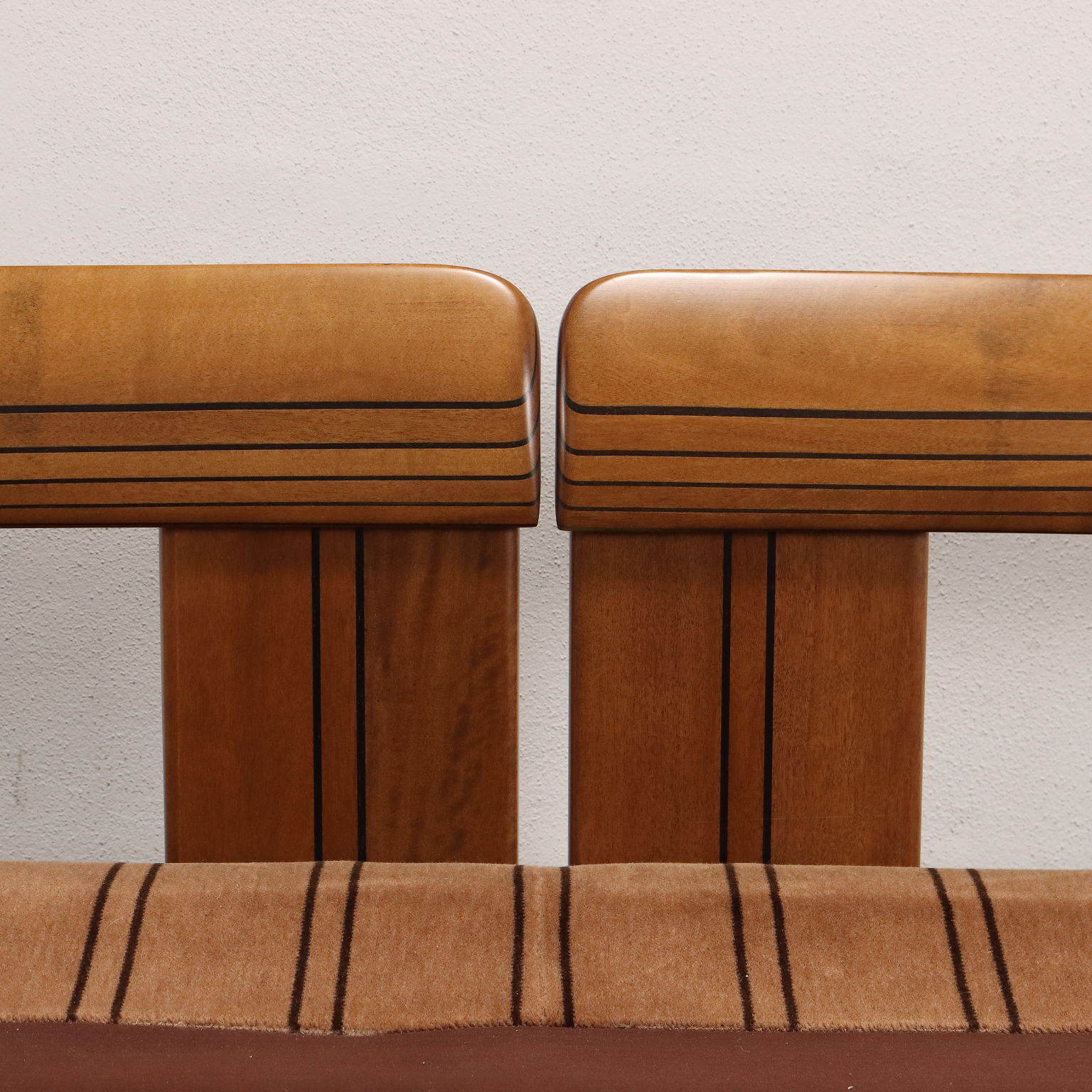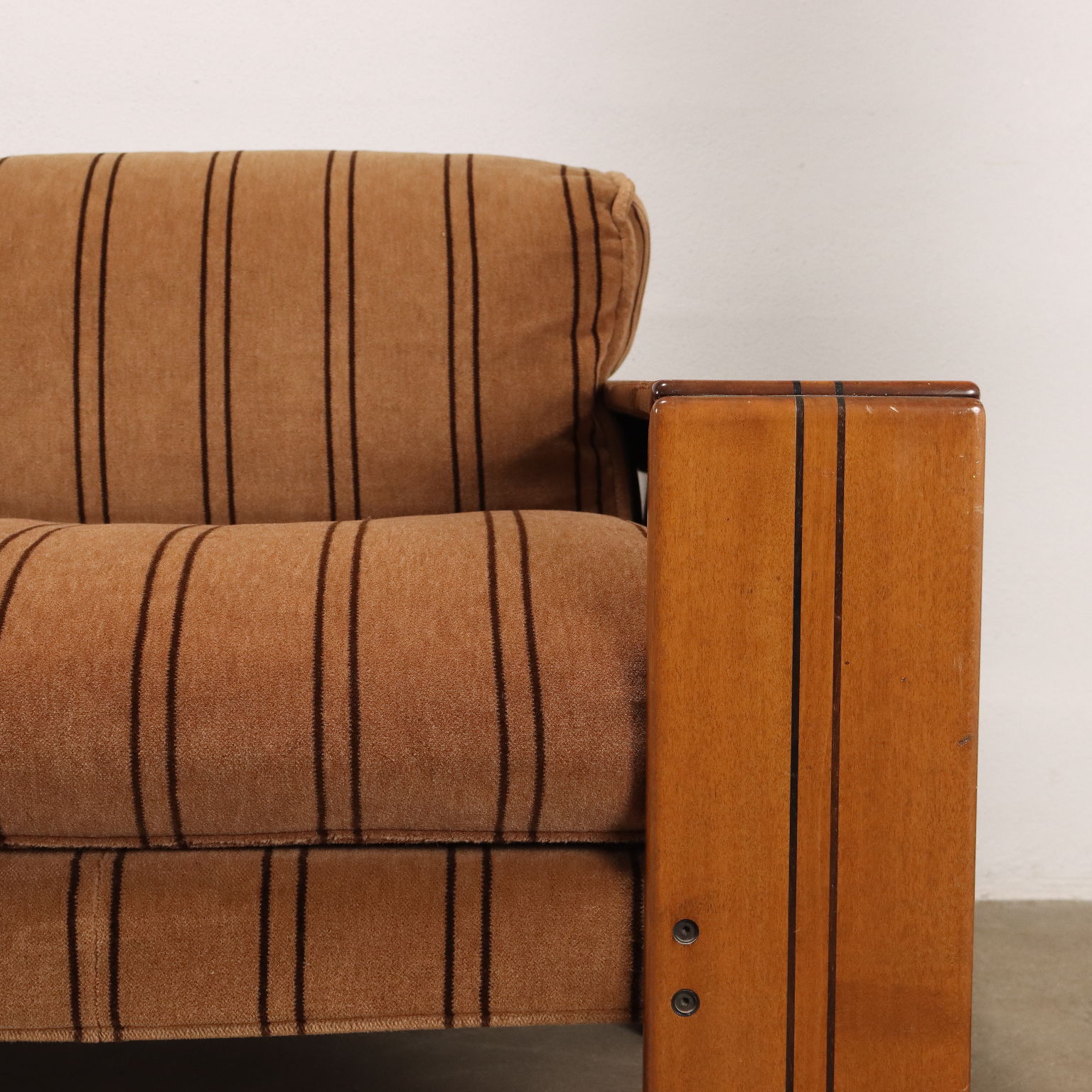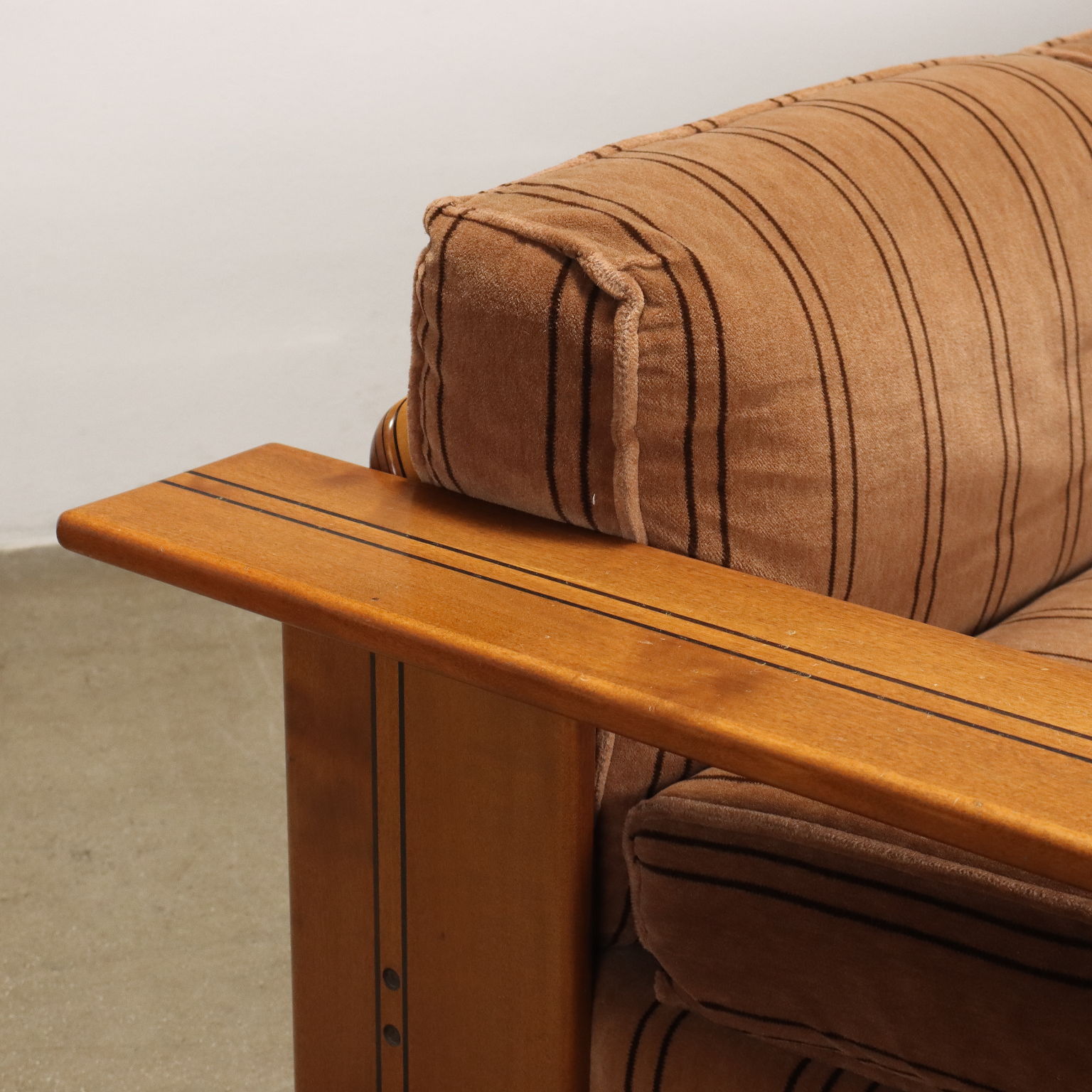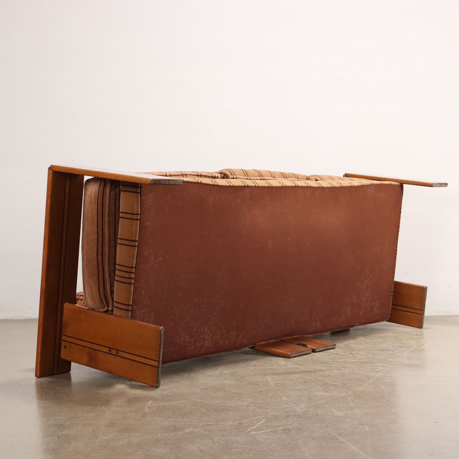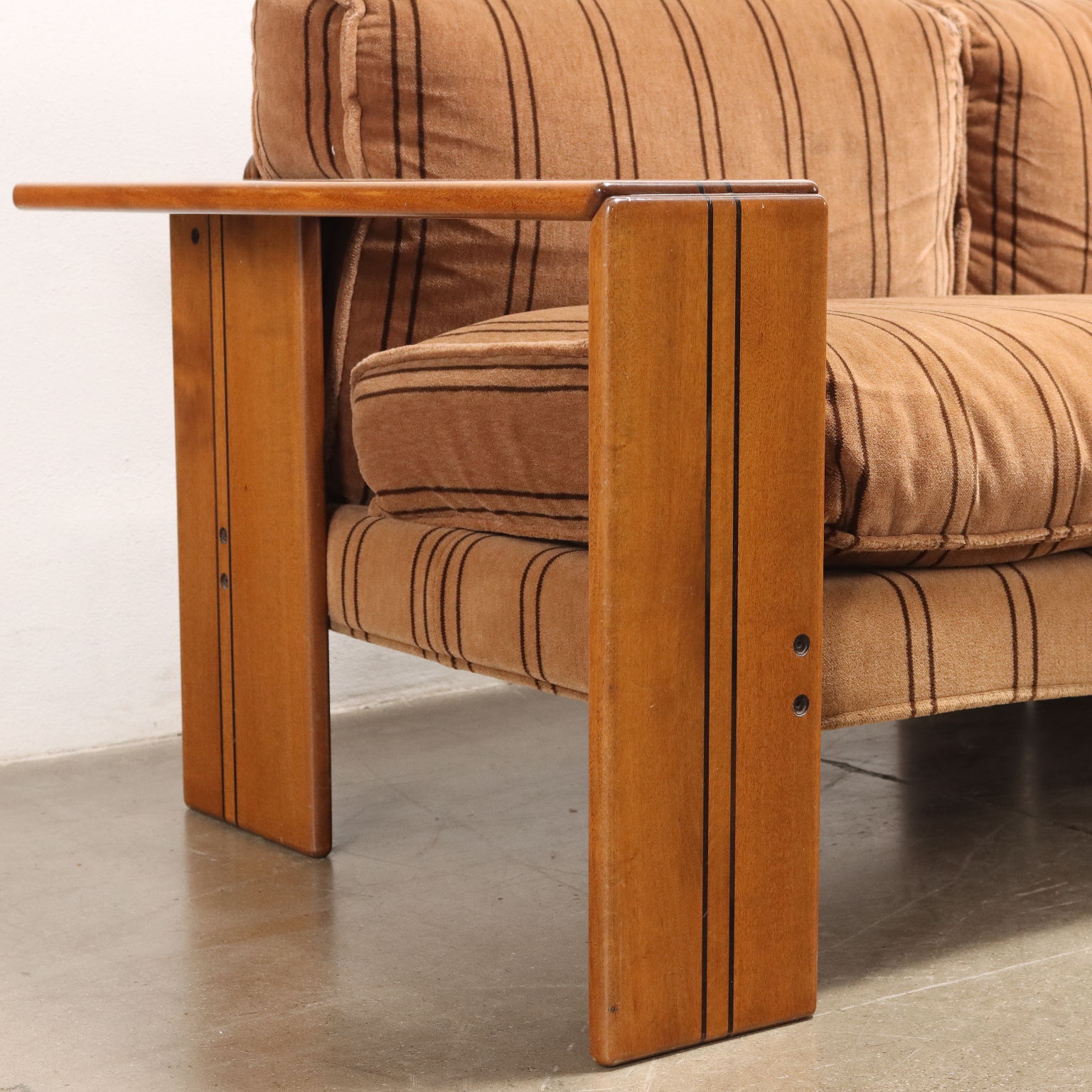 Divano a tre posti della serie 'Artona' disegnato da Afra e Tobia Scarpa per una produzione Maxalto anni '70. Seduta che si presenta in buone condizioni originali, con struttura in legno e stratificazioni in diverse essenze, seduta e schienale con imbottitura in espanso e rivestimento in tessuto del periodo. Cerniera di chiusura sotto alla struttura del divano non funzionante e coperta con una toppa come visibile in foto.